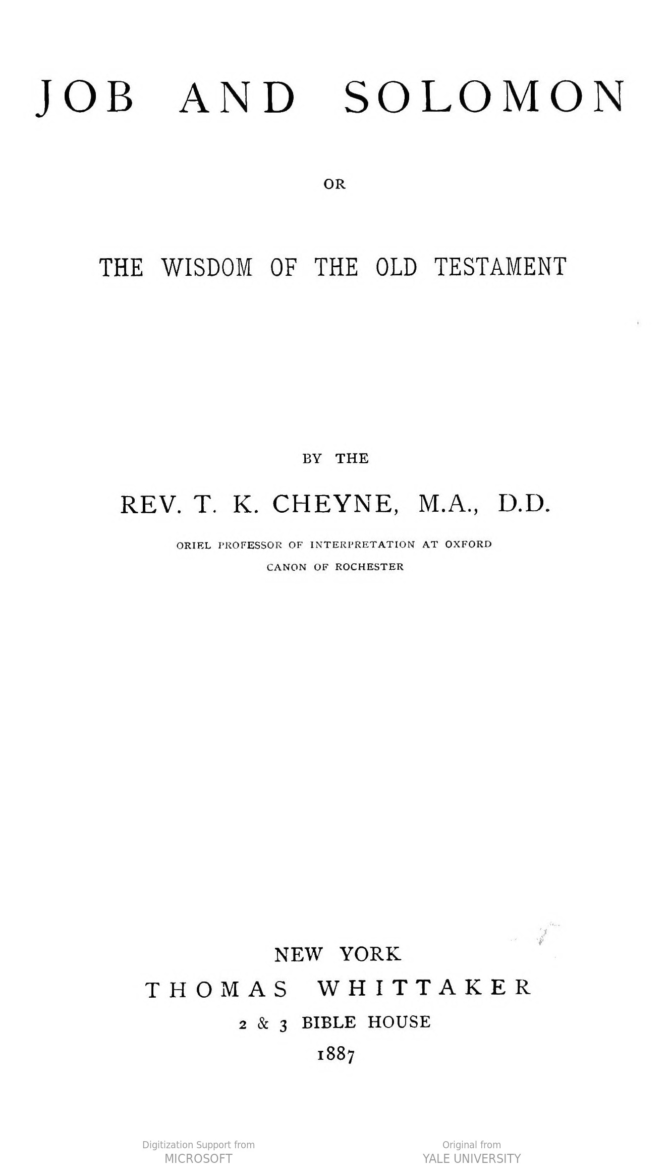 The Books of Job and Ecclesiastes are treated somewhat more in detail than those of Proverbs and Ecclesiasticus. The latter have a special interest of their own, but to bring this into full view, more excursions into pure philology would have been necessary than I judged it expedient to allow myself. I had intended to make up for this omission so far as Proverbs is concerned at the end of the volume, but have viiibeen interrupted in doing so. Perhaps, however, even in the Appendix such detailed treatment of special points might have repelled some readers, and I hope that the Appendix is on the whole not unreadable. The enlarged notes on Proverbs in the forthcoming new edition of Messrs. Eyre and Spottiswoode’s Variorum Bible may enable the student to do for himself what I have not done. As for Ecclesiasticus, the light which Prof. Bickell’s and Dr. Edersheim’s researches are sure to throw on the text may enable me some day to recast the section on this book; at present, I only offer this as an illustrative sequel to the section on Proverbs. It should be added that the canonicity of Ecclesiasticus is handled in conjunction with that of Ecclesiastes at the close of the part on the latter book.