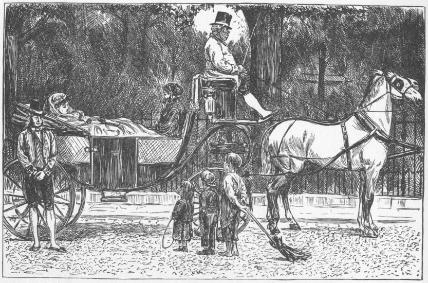 The drawing affords us many characteristics of his work. The lady in white reclining in the vehicle is a very embodiment of elegance, and the discerning drawing that defines the coachman repays observation, as also the "style" with which the white horse is swiftly shaded in. It was once the custom for the carriages of people in fashion to draw up under the trees in Berkeley Square, in summer, for tea brought out from Gunter's. Last summer one of the evening papers asked the question why the custom had lapsed. Du Maurier's drawing of the scene was accompanied by the following lines, which perhaps provide the answer.