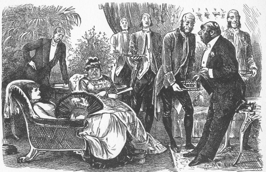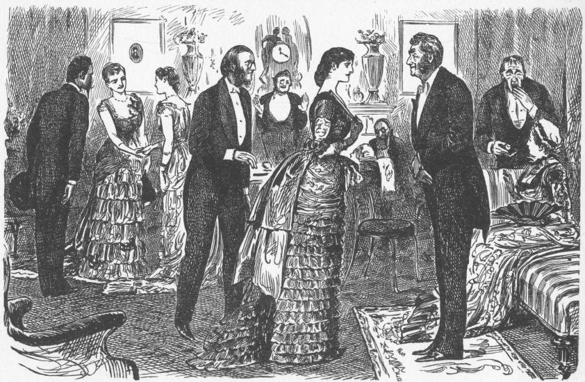 This is the conversation in the hall between two ladies leaving a party in one of du Maurier's most characteristic drawings. On every side there are footmen and a crowd of guests cloaking and departing. Of Mrs. Ponsonby de Tomkyns Mr. Henry James has said: "This lady is a real creation.... She is not one of the heroines of the æsthetic movement, though we may be sure she dabbles in that movement so far as it pays to do so. Mrs. Ponsonby de Tomkyns is a little of everything, in so far as anything pays. She is always on the look-out; she never misses an opportunity. She is not a specialist, for that cuts off too many opportunities, and the æsthetic people have the tort as the French say, to be specialists. No, Mrs. Ponsonby de Tomkyns is—what shall we call her?—well, she is the modern social spirit. She is prepared for everything; she is ready to take advantage of everything; she would invite Mr. Bradlaugh to dinner if she thought the Duchess would come to meet him. The Duchess is her great achievement—she never lets go of her Duchess. She is young, very nice-looking, slim, graceful, indefatigable. She tires poor Ponsonby completely out; she can keep going for hours after poor Ponsonby is reduced to stupefaction. This unfortunate husband is indeed almost stupefied. He is not, like his wife, a person of imagination. She leaves him far behind, though he is so inconvertible that if she were a less superior person he would have been a sad encumbrance. He always figures in the corner of the scenes in which she distinguishes herself, separated from her by something like the gulf that separated Caliban from Ariel. He has his hands in his pockets, his head poked forward; what is going on is quite beyond his comprehension. He vaguely wonders what his wife will do next; her manoeuvres quite transcend him. Mrs. Ponsonby de Tomkyns always succeeds. She is never at fault; she is as quick as the instinct of self-preservation. She is the little London lady who is determined to be a greater one—she pushes, gently but firmly—always pushes. At last she arrives."