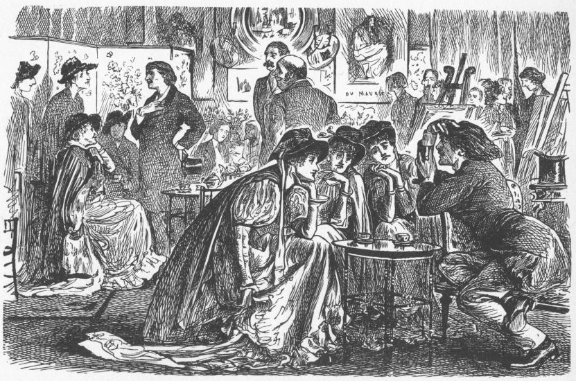 Sir Francis Burnand, till recently the distinguished Editor of Punch, was du Maurier's senior on the paper by a year or two. He has very kindly sent the writer the following impression of the artist: "That he was beloved as a cheery, witty confrère, goes without saying. Rarely did he mix himself up with politics in any shape or form. I doubt if he ever gave us any assistance in devising a political cartoon. What his politics were I am unable to say, and I do not think he troubled himself about the matter. In 'the old days' he delighted in chaffing Horace Mayhew, with whom he exchanged 'slang' in French. With the jovial proprietor, William Bradbury, he was always on the best of terms of friendly nonsense, being invariably his left-hand neighbour at 'The Table.' He was a genuine Bohemian of the artistic fraternity (as given in his Trilby) with the true polish of an English gentleman, of the kindest disposition, and of the warmest heart. All who knew him well loved him, and none missed him more than his fellow-workers on Punch."