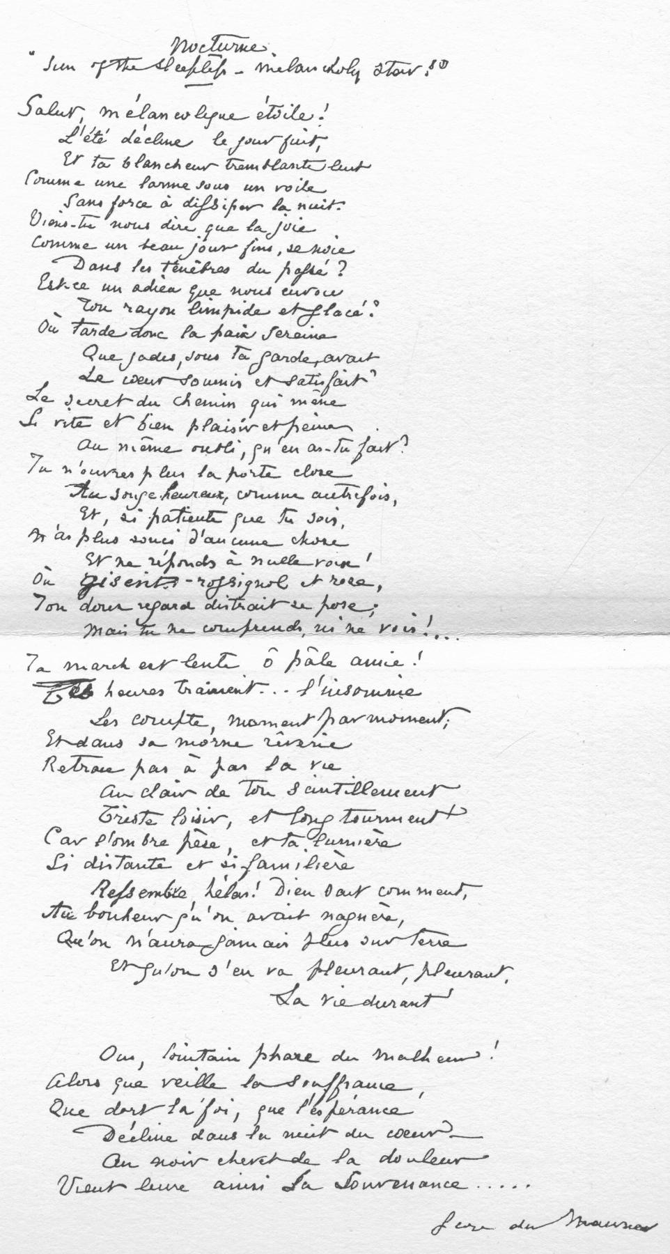 And du Maurier's handwriting—witness the manuscript for his French version of Byron's "Sun of the sleepless—melancholy star!" which appeared in the Illustrated Magazine—is characteristic of an exquisite artist in its pleasant nervous beauty of style. It is the writing of one who could have etched. Etching demands only the most autographic features of a man's draughtsmanship; it prevents him from spreading himself in the irrelevancies of space-covering lines necessary in work done to meet the demand of the Editor's measure. The demand must have its effect on those who meet it, in diluting the intimate quality of their work, so that it is not always easy to estimate the real strength of artistic impulse in it.