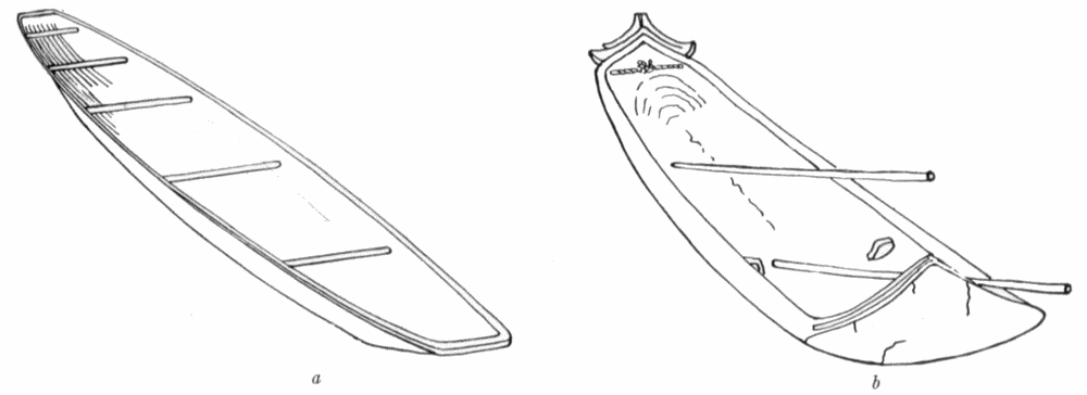 Concerning the distribution, in a northerly direction, of these types of canoes, little can be said at the present time. As remarked above, the Kwakiutl use in place of the αο´τχς, a great sea-going canoe of somewhat different and more complicated model, and much more elaborately ornamented.
