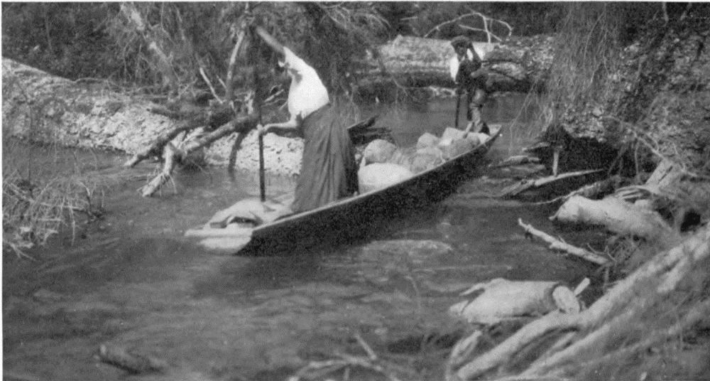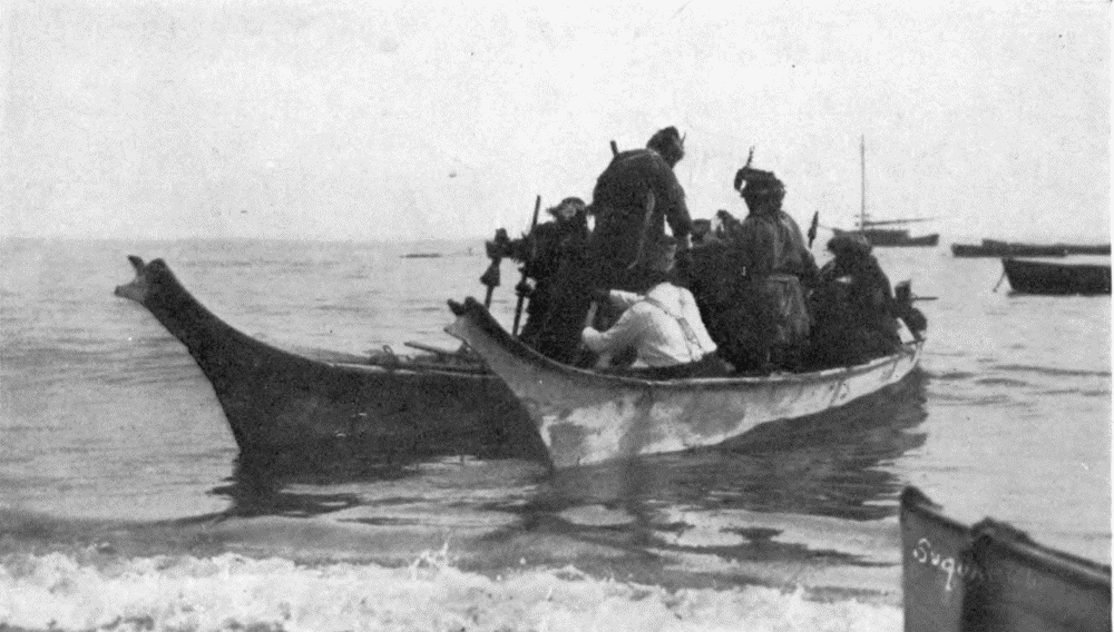 The idea seems plausible, however, that the original type of canoe on the Northwest coast was the shovel-nose. Several considerations point in this direction. The shovel-nose is the simplest model. This raises a logical presumption that it may well be the oldest. It is associated with rivers, being of use only in streams and other quiet water. This also suggests that it may represent an early type. It may be regarded as certain that the first man or the first group who experimented with navigation on the North Pacific coast, experimented on the rivers, and not on the high seas. This would seem to imply that the river craft would be the first to reach perfection. The sea-going “Chinook” type, and models showing points of similarity to it, are in all human probability later in origin. When we consider the distribution of the various types of canoes, we emerge for a moment from the jungle of speculation into the field of evidence, though that evidence is scanty. It is a fact that the shovel-nose type of canoe is of wider distribution than the other types. It is the only type found in the marginal regions to the east and south of the area of typical North Pacific Coast culture. Thus is raised the presumption that it represents an older type of craft than do the other models.