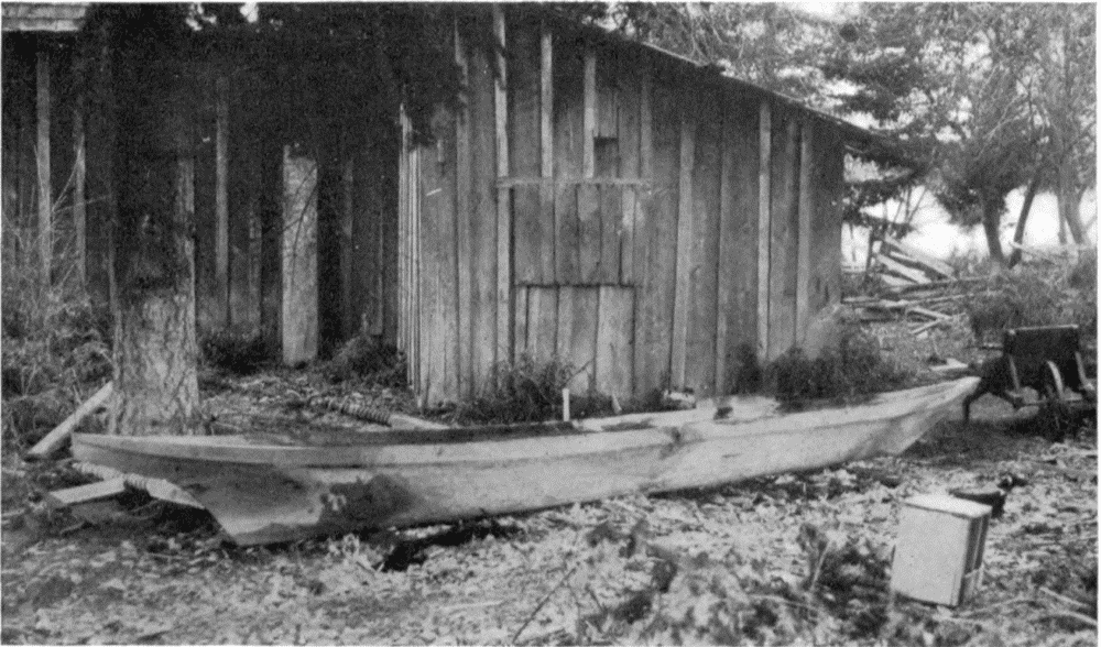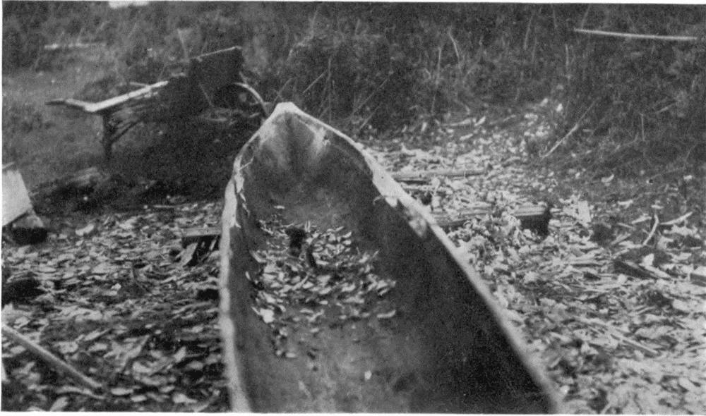 When the side of a canoe is broken, a section is cut out bodily, a piece of plank being carefully shaped to fit in the space. This plank is fastened in place with cedar pegs and by “sewing” with cedar withes.