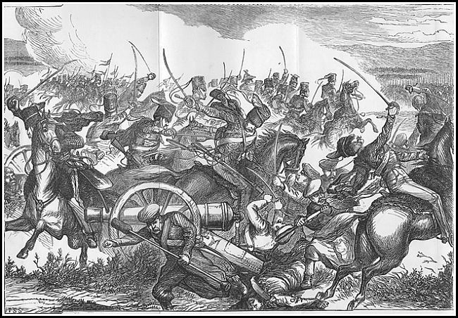 [53] It was repeatedly proved, during this sanguinary struggle, that man to man, the enemy’s cavalry, although clad in glittering steel, could not withstand our heavy Dragoons. They rode completely over them, time after time; their ringing shouts of Vive l’Empereur being more than once altered to “Quarter! quarter!” with the Union Brigade riding victoriously through or over them. It was then as at Balaclava: “Hurrah! hurrah!” and “Hurrah for Ould Ireland and Scotland for ever.” They shall not lord it over us. And then, as if they were pasteboard (the foe is advancing)—