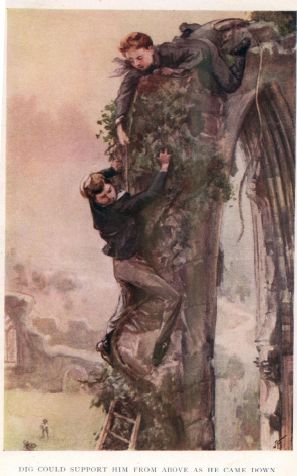 He gave a whistle to Dig, and pointed with his thumb over his shoulder. Dig, who was in the middle of a pull at the ginger ale, put down his tankard suddenly and crammed his handkerchief into his mouth.