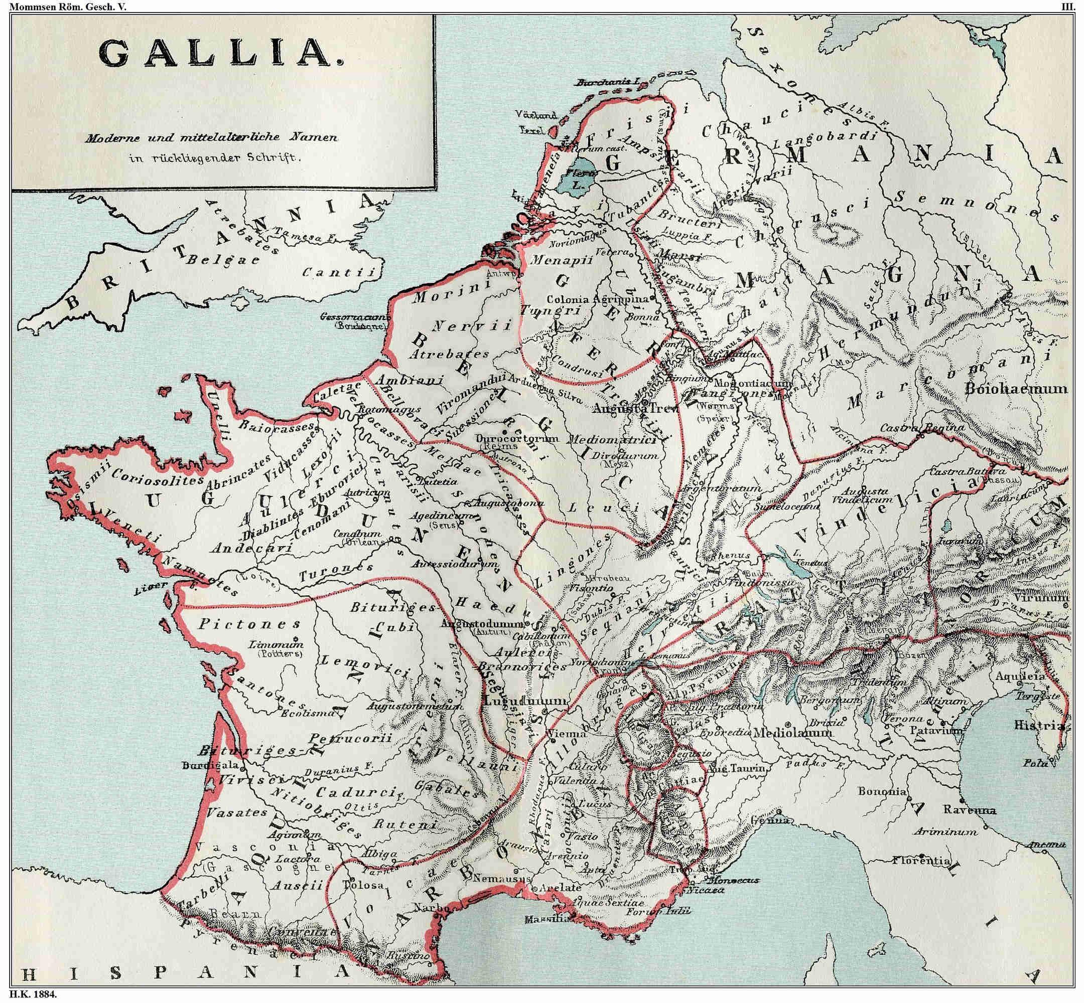 Roads and colonies in the Alps.Next to the protection of the peace of Italy the chief aim of this organisation was to secure its communications with the north, which were of not less urgent importance for traffic than in a military point of view. With special energy Augustus took up this task; and he doubtless deserved that his name should still live at the present day in those of Aosta and Augsburg, perhaps also in that of the Julian Alps. The old coast–road, which Augustus partly renewed, partly constructed, from the Ligurian coast through Gaul and Spain to the Atlantic Ocean, can only have served purposes of traffic. The road also over the Cottian Alps, already opened up by Pompeius (iv. 28)iv. 27., was finished under Augustus by the already mentioned prince of Susa, and named after him; in like manner a trading route, it connects Italy, by way of Turin and Susa, with the commercial capital of south Gaul, Arelate. But the military line proper—the direct connection between Italy and the camps on the Rhine—led through the valley of the Dora Baltea from Italy partly to Lyons the capital of Gaul, partly to the Rhine. While the republic had confined itself to bringing into its power the entrance of that valley by founding Eporedia (Ivrea), Augustus possessed himself of it entirely by not merely subjugating its inhabitants—the still restless Salassi, with whom he had already fought during the Dalmatian war—but extirpating them outright; 36,000 of them, including 8000 fighting men, were sold under the hammer into slavery in the market–place of Eporedia, and the purchasers were bound not to grant freedom to any of them within twenty years. The camp itself, from which his general Varro Murena had achieved their final defeat in 72925., became the fortress, which, occupied by 3000 settlers taken from the imperial guard, was to secure the communications—the town Augusta Praetoria, the modern Aosta, whose walls and gates then erected are still standing. It commanded subsequently two Alpine routes, as well that which led20 over the Graian Alps or Little St. Bernard, along the upper Isère and the Rhone to Lyons, as that which ran over the Poenine Alps, the Great St. Bernard, to the valley of the Rhone and to the Lake of Geneva, and thence into the valleys of the Aar and the Rhine. But it was for the first of these roads that the town was designed, as it originally had only gates leading east and west; nor could this be otherwise, for the fortress was built ten years before the occupation of Raetia; in those years, moreover, the later organisation of the camps on the Rhine was not yet in existence, and the direct connection between the capitals of Italy and Gaul was altogether of the foremost importance. In the direction of the Danube we have already mentioned the laying out of Emona on the upper Save, on the old trade–road from Aquileia over the Julian Alps into the Pannonian territory. This road was at the same time the chief artery for the military communication of Italy with the region of the Danube. Lastly, with the conquest of Raetia was connected the opening of the route which led from the last Italian town Tridentum (Trent), up the Adige valley, to the newly established Augusta in the land of the Vindelici, the modern Augsburg, and onward to the upper Danube. Subsequently, when the son of the general who had first opened up this region came to reign, this road received the name of the Claudian highway.5 It furnished the means of connection, indispensable from a military point of view, between Raetia and Italy; but in consequence of the comparatively small importance of the Raetian army,21 and doubtless also in consequence of the more difficult communication, it never had the same importance as the route of Aosta.