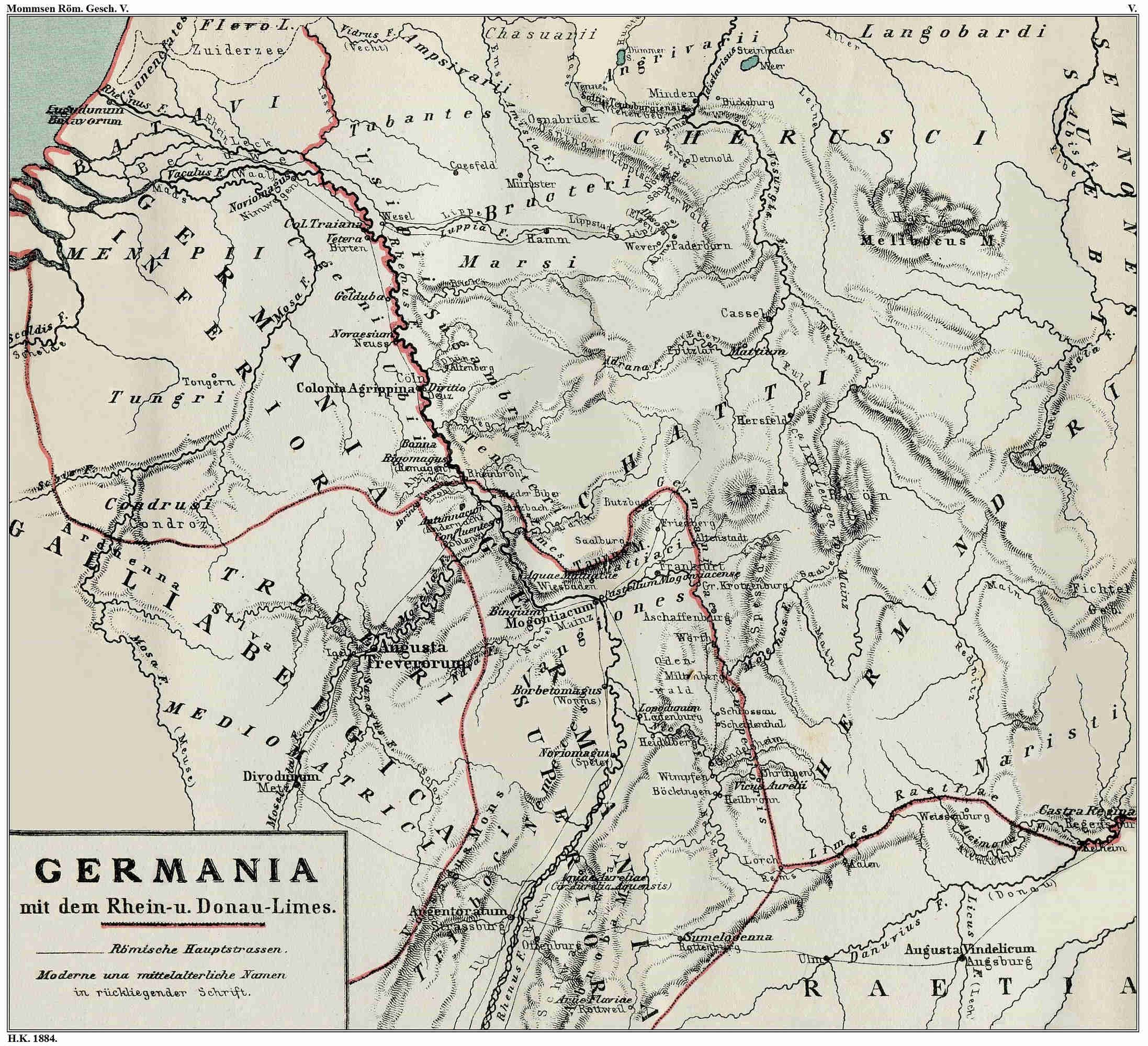 Camp on the left bank of the Rhine.Of the military–political organisation of Germany, as at that time planned, we have but a very imperfect knowledge, because, on the one hand, there is an utter want of accurate information as to the arrangements made in earlier times to protect the Gallic eastern frontier, and, on the other hand, those made by the two brothers were in great part destroyed by the subsequent development of affairs. There was no attempt to move the Roman frontier–guard away from the Rhine; to this matters might perhaps come, but they had not yet done so. Just as was the case in Illyricum at that time with the Danube, the Elbe was doubtless the political boundary of the empire, but the Rhine was the line of frontier–defence, and from the camps on the Rhine the connections in rear ran to the great towns of Gaul and to its ports.1032 The great headquarters during these campaigns was what was afterwards named the “Old Camp,” Castra vetera, (Birten near Xanten), the first considerable height below Bonn on the left bank of the Rhine, from a military point of view corresponding nearly to the modern Wesel on the right. This place, occupied perhaps since the beginning of the Roman rule on the Rhine, had been instituted by Augustus as a stronghold for curbing Germany; and, if the fortress was at all times the basis for the Roman defensive on the left bank of the Rhine, it was not less well chosen for the invasion of the right, situated, as it was, opposite to the mouth of the Lippe which was navigable far up, and connected with the right bank by a strong bridge. The counterpart to this “Old Camp,” at the mouth of the Lippe was probably formed by that at the mouth of the Main, Mogontiacum, the modern Mentz, to all appearance a creation of Drusus; at least the already mentioned cessions of territory imposed on the Chatti, as well as the constructions in the Taunus to be mentioned further on, show that Drusus clearly perceived the military importance of the line of the Main, and thus also that of its key on the left bank of the Rhine. If the legionary camp on the Aar was, as it would seem, instituted to keep the Raeti and Vindelici to their obedience (p. 18), it may be presumed to have been laid out about this time; but then it had merely an outward connection with the Gallico–German military arrangements. The legionary camp at Strassburg hardly reaches back to so early a time. The line from Mentz to Wesel formed the basis of the Roman military dispositions. That Drusus and Tiberius had—apart from the Narbonese province which was then no longer imperial—the governorship of all Gaul as well as the command of all the33 Rhenish legions, is an ascertained point; apart from these princes, the civil administration of Gaul may at that time perhaps have been separated from the command of the troops on the Rhine, but scarcely was the latter thus early divided into two co–ordinate commands.11