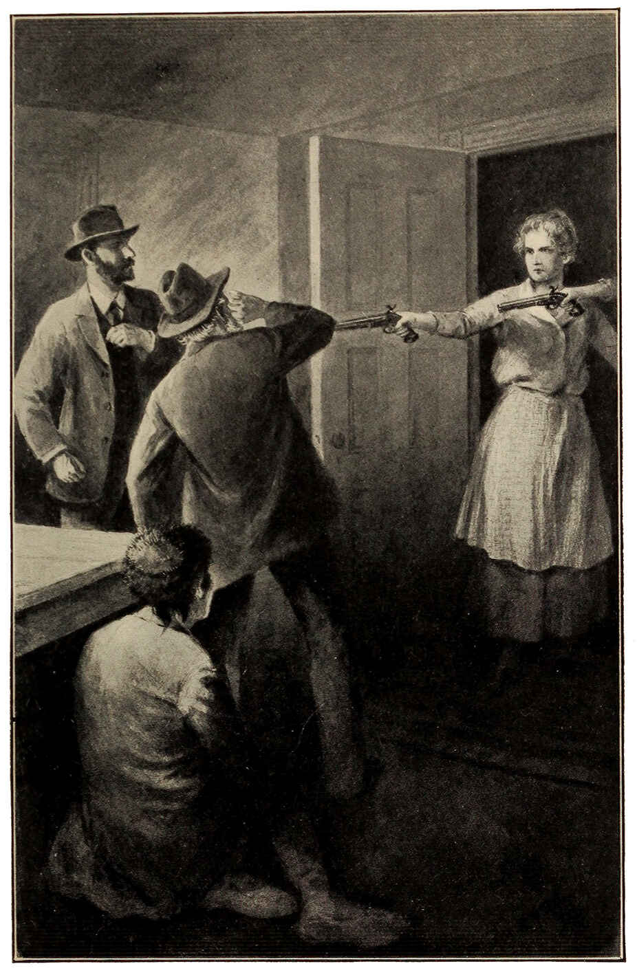 Mrs. O’Dell put up her left hand and relieved the child of the other pistol, at the same time speaking a few words in a low voice but without taking her glance or her aim off the intruders. Marion slipped past her, ran over and took Lunt’s gun from where he had stood it against the wall.