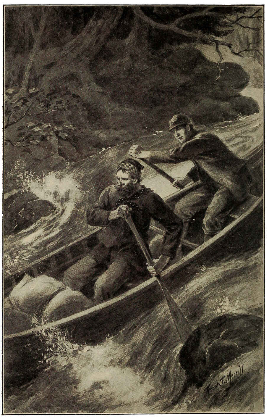 “UP CAME THE RAGING WATERS, UP AND PAST THE JUMPING, SQUIRMING CANOE.”