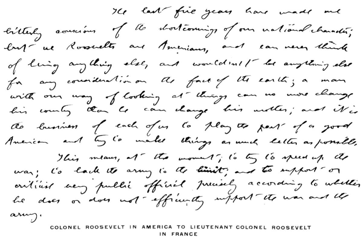 "New Year's greetings to you! This may or may not be, on the whole, a happy New Year—almost certainly it will be in part at least a New Year of sorrow—but at least you and your brothers will be upborne by the self-reliant pride coming from having played well and manfully a man's part when the great crisis came, the great crisis that 'sifted [vi]out men's souls' and winnowed the chaff from the grain."—January 1, 1918.
