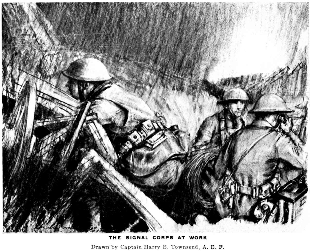 | THE SIGNAL CORPS AT WORK Drawn by Captain Harry E. Townsend, A. E. F. |