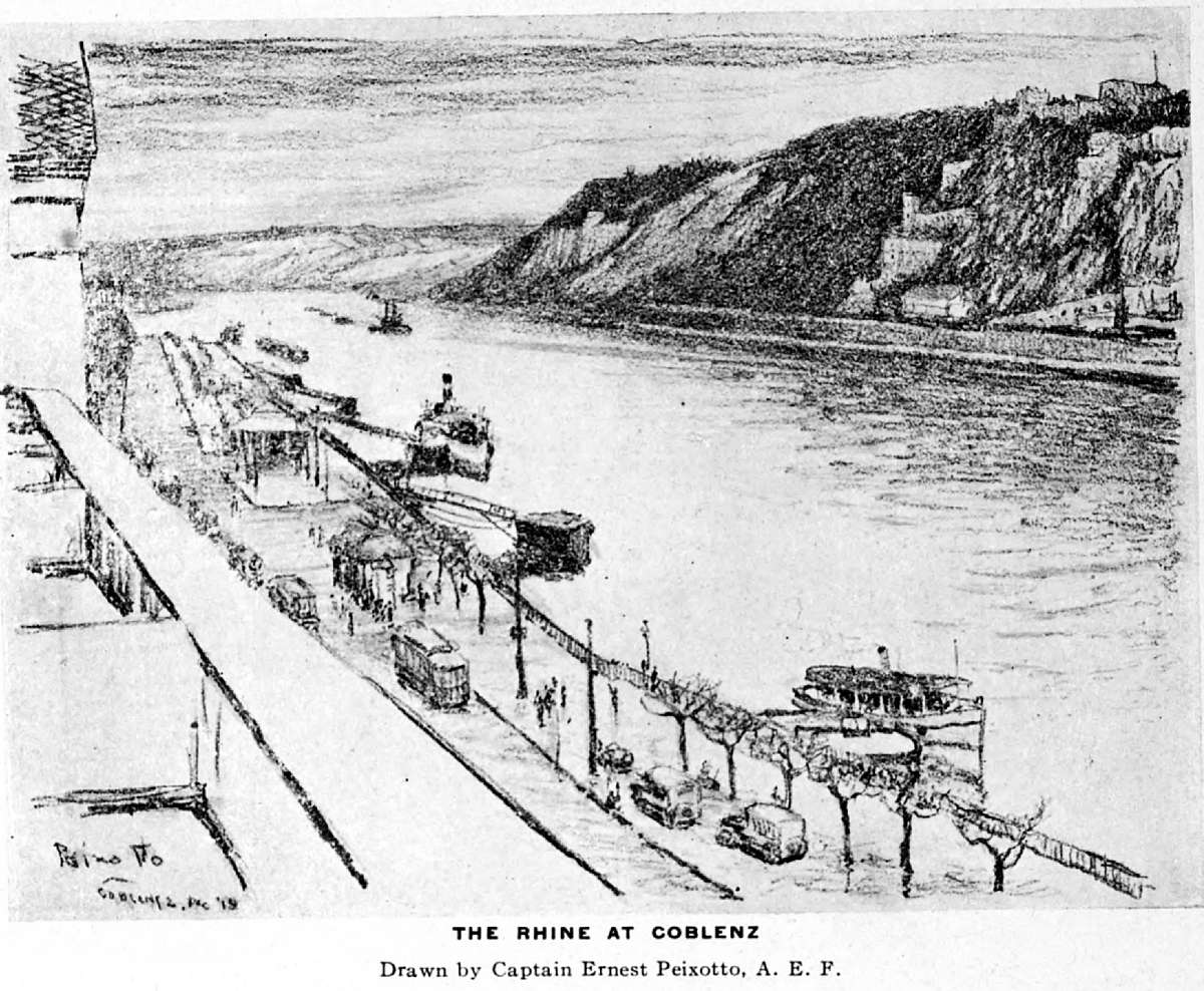 | THE RHINE AT COBLENZ Drawn by Captain Ernest Peixotto, A. E. F. |
