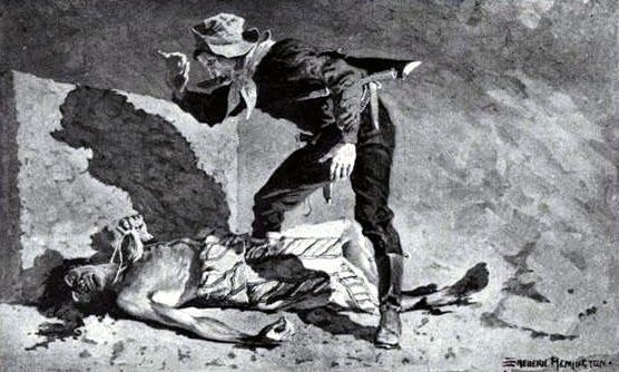 For a minute or two longer Young maintained his grasp. Then rising to his feet, breathing heavily, he wiped the sweat from his face as he exclaimed, at the same moment giving the dead body a vicious kick: "You black devil, take that! Now I've squared accounts with you for killin' th' Padre—and it's the best day's work I've ever done!"