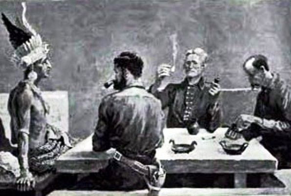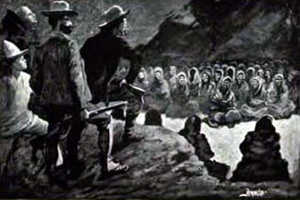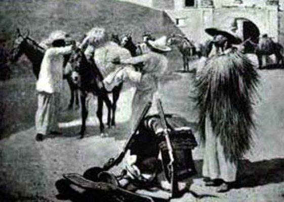 When we ceased firing it was impossible to see anything in the oratory, because of the dense cloud of sulphurous smoke wherewith it was filled; but such shrieks and yells of soul-racking terror as came from beneath that black canopy I hope I may never hear again. I waited a little, until this wild outburst had somewhat quieted, and then—placing my mouth close to one of the openings and speaking in a voice that I tried to make like that of Fray Antonio—I said, in deep and solemn tones, "Behold the vengeance of the strangers' God!"