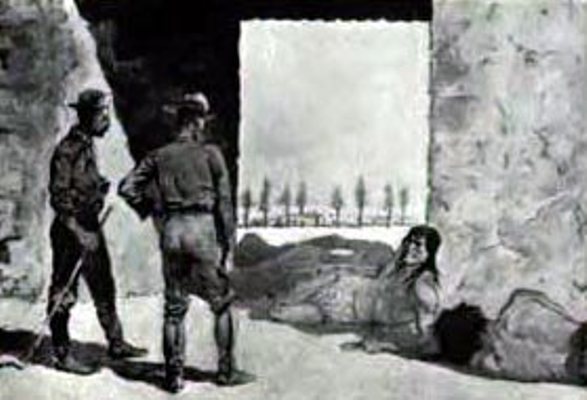 Fortunately, a little spring came out from the rock, clear and cool, just inside the cave; and game was so abundant on that mountain-side that Young came back presently from a foraging expedition with half a dozen codornices, that he had come so close to as to shoot with his revolver, and a jack-rabbit that he actually had caught with his hands as it jumped up almost beneath his feet; which excellent fare made a most satisfying supper for all of us; and eating it so added to Rayburn's strength—as we could tell by the fuller tones of his voice, and by his being able to move a little on his bed without our helping him—as to rouse in us a warm hope that the death that seemed so near to him might yet be thrust away. Our chief concern, lest the shock that would come to him of knowing it should fairly kill him, was to hide from him for the present the knowledge that Fray Antonio was dead; and to compass this end we plumply told him the flat-footed lie that the monk had gone on in search of some town whence he might bring back horses and supplies; and so, for a time, we laid at rest his doubts.