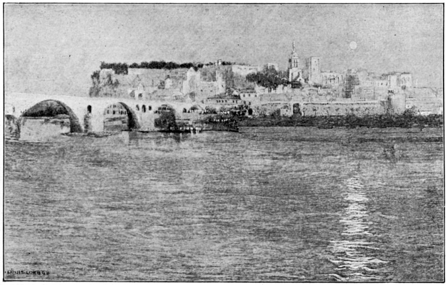 Having escaped from the Defile of Donzère,[191] the river wanders away restfully into a wilderness of islands—a maze so unexplored and so unexplorable that otters still make their home in it, and through the thick foliage poke out their snub noses at passing boatmen now and then. Thence onward for a long way islands are plentiful—past Pierrelatte, and Bourg-Saint-Andéol, (a very ancient and highly Roman flavoured town), and the confluence of the Rhône and the Ardèche—to the still larger archipelago across which the Bridge Building Brothers, with God himself helping them, built the Pont-Saint-Esprit.