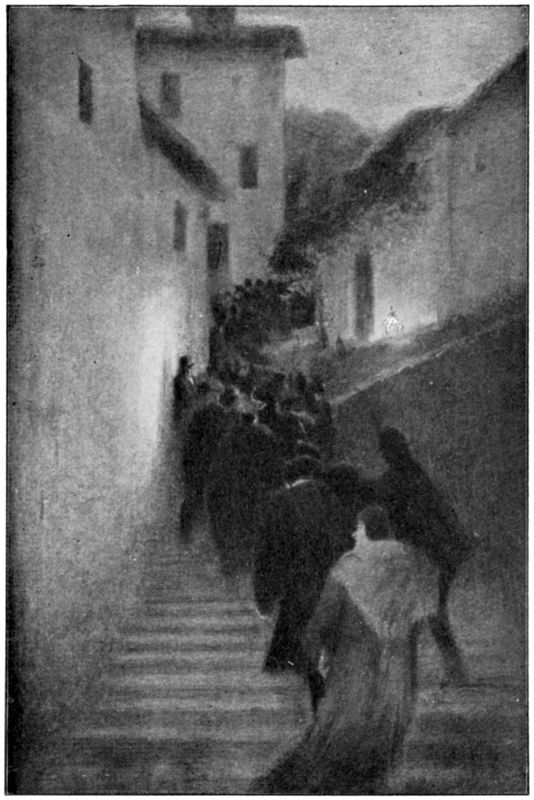 Naturally, the third-class seats were the most in demand; and from the moment that the gates were opened the way to them was thronged: an acute ascent—partly rough stairway, partly abrupt incline—which zigzagged up the hill between the wall of the theatre and the wall of an adjacent house and which was lighted, just below its sharpest turn, by a single lamp pendant from an outjutting gibbet of iron. By a lucky mischance, three of the incompetent officials on duty at the first-class entrance—whereat, in default of guiding signs, we happened first to apply ourselves—examined in turn our tickets and assured us that the way to our second-class places was up that stairway-path. But we heartily forgave, and even blessed, the stupidity of those officials, because it put us in the way of seeing quite the most picturesque bit that we saw that night outside of the theatre's walls: the strong current of eager hu[236]manity, all vague and confused and sombre, pressing upward through the shadows, showing for a single moment—the hurrying mass resolved into individual hurrying figures—as it passed beneath the hanging lamp, and in the same breath swept around the projecting corner and lost to view. It looked, at the very least, treasons, conspiracies, and mutinous outbursts—that shadowy multitude surging up that narrow and steep and desperately crooked dusky footway. I felt that just around the lighted turn, where the impetuous forms appeared clearly in the moment of their disappearance, surely must be the royal palace they were bent upon sacking; and it was with a sigh of unsatisfied longing that I turned away (when we got at last the right direction) before word came to me that over the swords of his dying guardsmen they had pressed in and slain the king!
