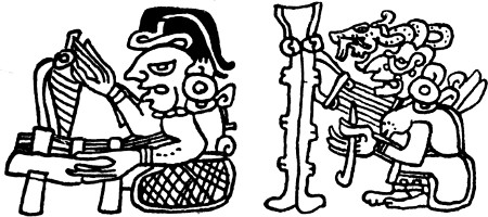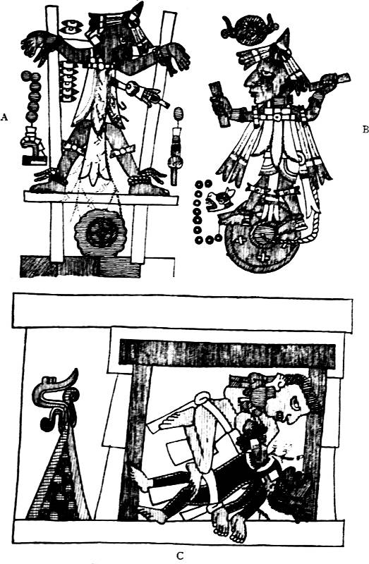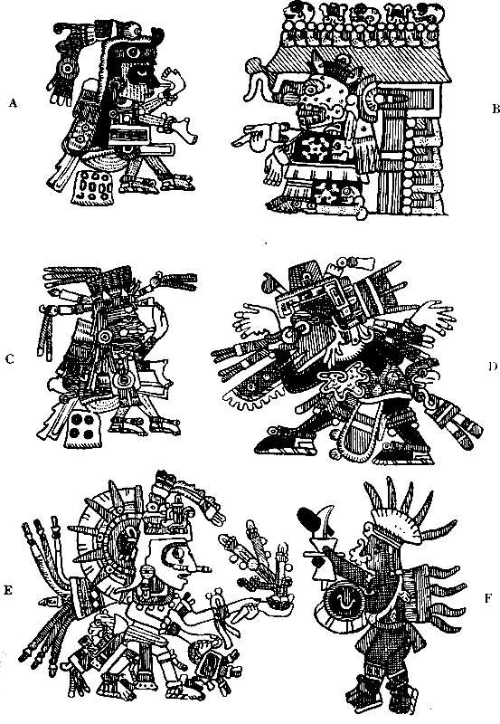 [11] The use of the rising of the morning star to commence a solar time-count would explain the peculiar fact that the commencement of the year never coincided with that of the tonalamatl. It has been stated (p. 77) that the initial days of the Venus-periods were cipactli, coatl, atl, acatl, and olin; cipactli being the initial day also of the tonalamatl. But the day acatl was not only one of the initial days of the 365-day year, but was the initial day also of the Mexican double cycle of 104 years, which was in addition the initial day of a complete cycle of Venus-periods. The conclusion is tempting, that after the invention of the tonalamatl, correlated with the observation of the planet Venus, a change was made to solar time as near as it could be observed. As a starting-point for the new system, the next heliacal rising of the planet was awaited, and this occurring on an acatl day fixed the “year-bearers” as acatl, tecpatl, calli, and tochtli. It will be remembered that the Mexicans believed that the historical sun rose on the day 13. acatl (p. 73). At any rate, the Venus-period seems to form a link between the tonalamatl and the year of 365 days. The fact that none of the gods of the hunting-tribes find a place among the deities presiding over the tonalamatl would seem sufficient proof that the Chichimec, Aztec, and Otomi had no hand in its invention.