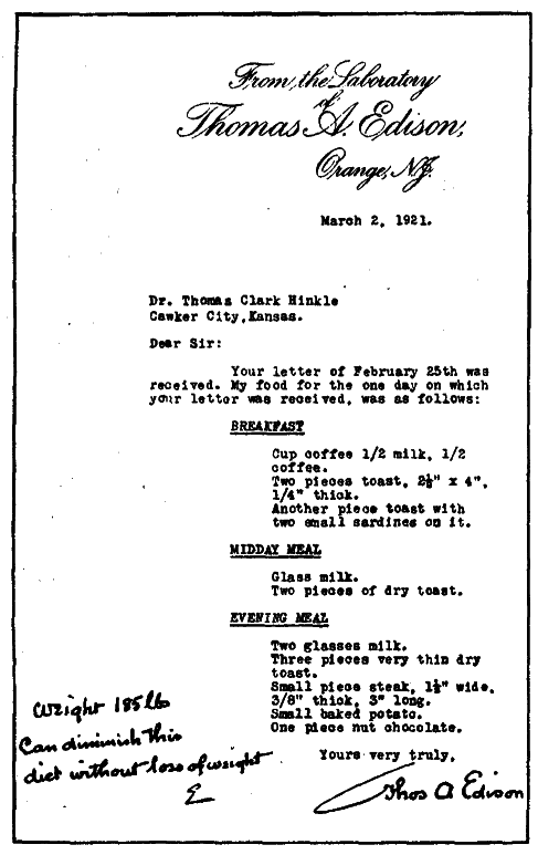 The world-renowned American inventor, Thomas A. Edison, now in his 75th year, has today a mind as brilliant and ingenious,84 and a skill as remarkable for inventing things that are of practical use, as when at 21 he invented his automatic repeater which did so much for telegraphy. And Edison is another spare eater. What he ate at the three meals of the day on which he wrote the following letter, is characteristic of the small amount he eats every day in the year.