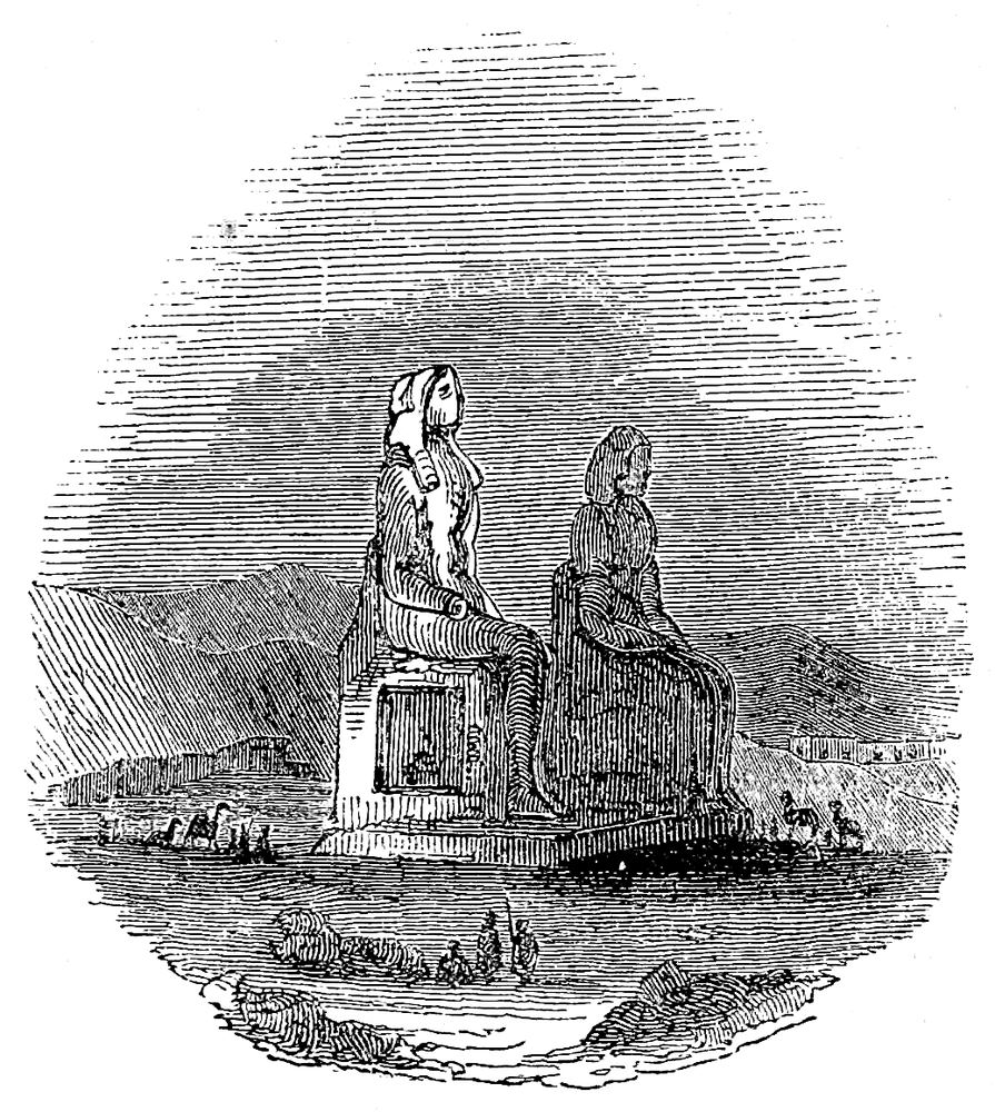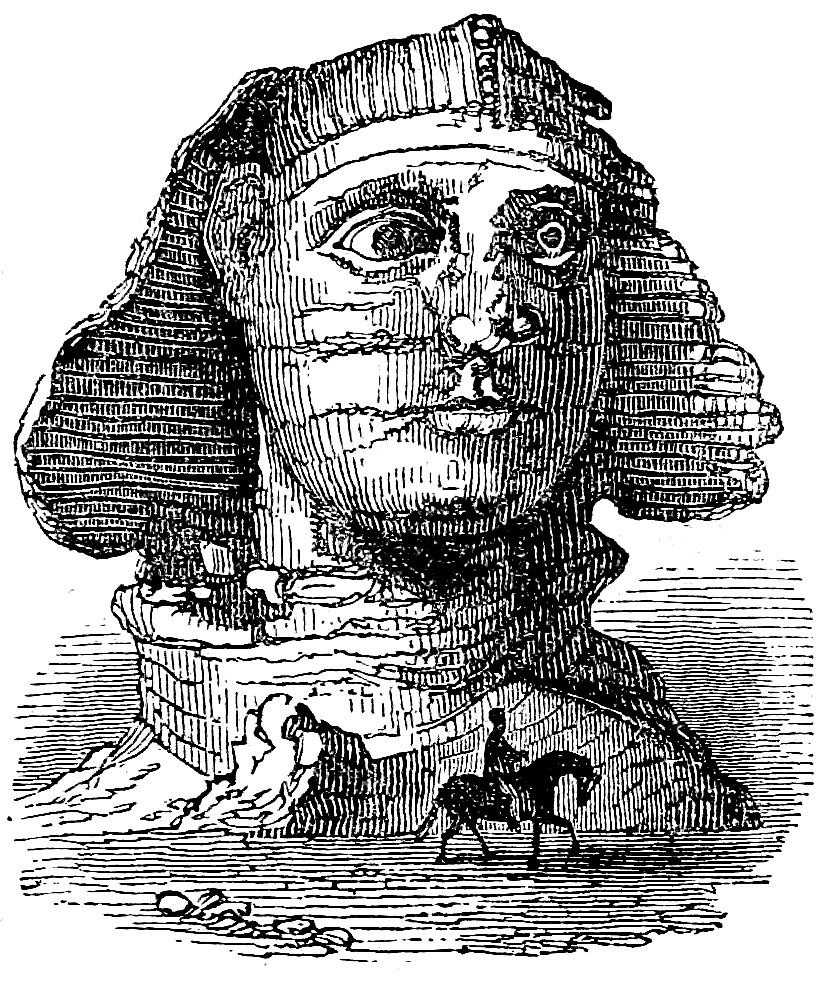 To narrate all the enterprises of Belzoni would occupy volumes. Let us allude but to one more. He uncovered the front of the great Sphynx—that gigantic monument which has been synonymous with “Mystery” from the remotest ages of history. Numerous pieces of antiquity were as unexpectedly as extraordinarily developed by this enterprise—pieces which, for many centuries, had not been exposed to human eyes. Among other things, a beautiful temple, cut out of one piece of granite, yet of considerable dimensions, was discovered between the legs of the sphynx, having within it a sculptured lion and a small sphynx. In one of the paws of the great sphynx was another temple with a sculptured[Pg 242] lion standing on an altar. In front of the great sphynx were the remains of buildings, apparently temples, and several granite slabs with inscriptions cut into them, some entire and others broken. One of these is by Claudius Cæsar, recording his visits to the pyramids, and another by Antoninus Pius, both of which, with the little lions, are now in the British Museum.
