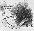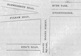 From Knightsbridge, formerly a suburb, and now part of London, the main roads to Fulham and Hammersmith branch off at the north end of Sloane Street (about a quarter of a mile west of Hyde Park Corner), thus:—