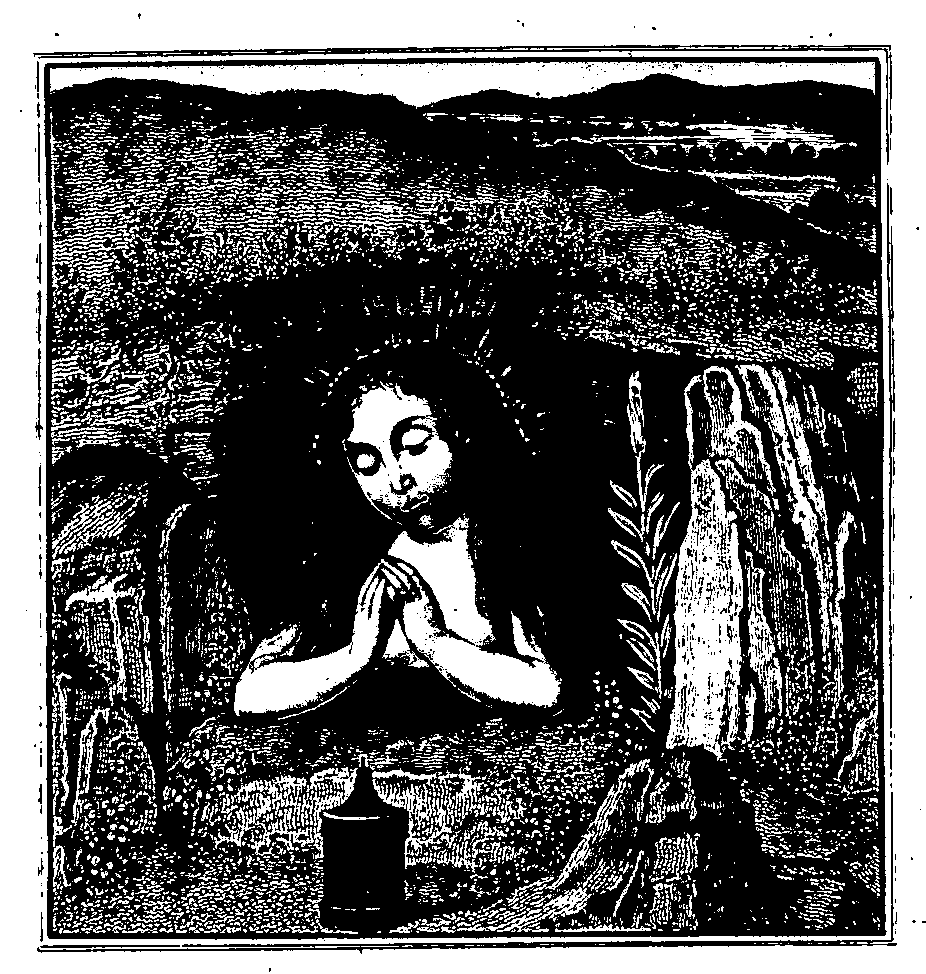 There are two or three Missals deserving only of brief notice. One, of the XIVth century, is executed in large gothic letter; having an exceedingly vivid and fresh illumination of a crucifixion, but in bad taste, opposite the well-known passage of "Te igitur clementissime," &c. It is bound in red satin. Two missals of the xvth century--of which one presents only a few interesting prints connected with art. It is ornamented in a sort of bistre outline, preparatory to colouring--of which numerous examples may be seen in the Breviary of the Duke of Bedford in the Royal Library at Paris.13 I examined half a dozen more Missals, which the kind activity of M. Le Bret had placed before me, and among them found nothing deserving of particular observation,--except a thick, short, octavo volume, in the German language, with characteristic and rather clever embellishments; especially in the borders.