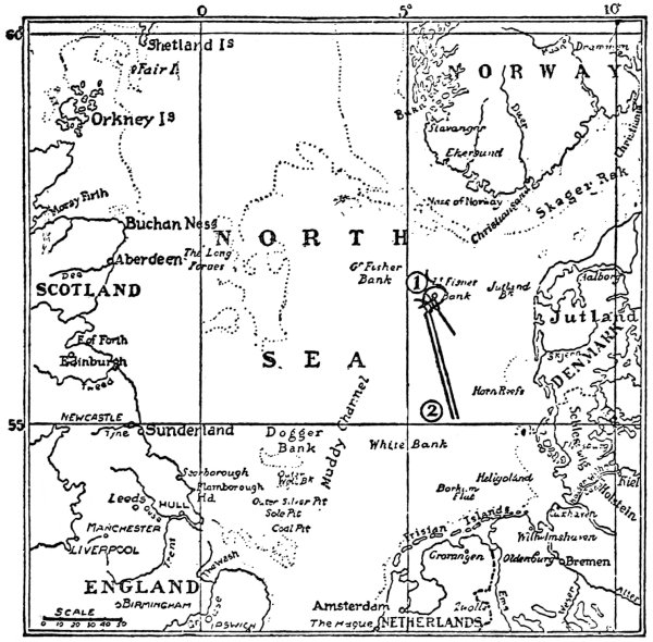 Admiral Scheer’s fleet had arrived off Horn Reef at 3 A.M., where he waited for the disabled Lützow.44 At 3.30 he learned that she had been abandoned. Up to that time the German Admiral had expected a new battle of fleets, but he soon divined that he was to be free from pressure on the part of his enemy. This was confirmed when Admiral Scheer learned through a German aircraft scout of the straggling of Lord Jellicoe’s ships. (L 11 was the airship reported by the British “shortly after 3.30.”) Admiral Scheer’s comment is: “It is obvious that this scattering of the forces—which can only be explained by the fact that after the day-battle Admiral Jellicoe had lost the general command—induced the Admiral to avoid a fresh battle.” Both commanders are consequently on record in agreement as to the reason for no new battle of fleets.