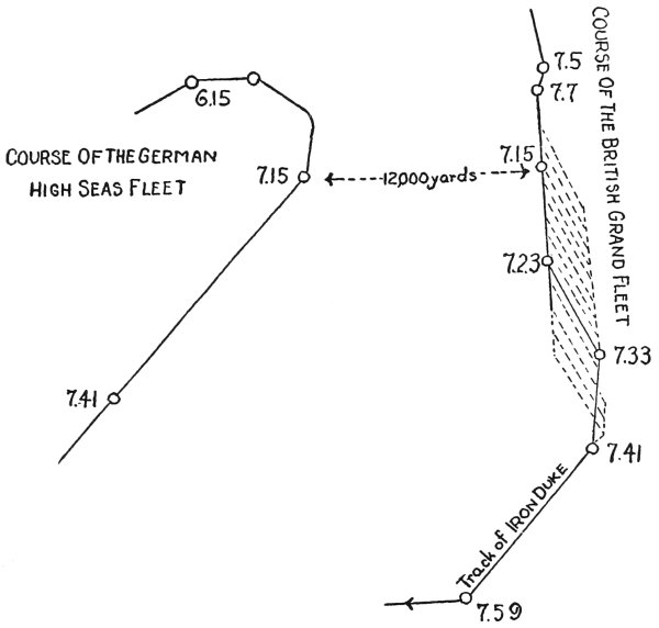 The straggling of portions of his fleet during the move through the darkness is explained by Lord Jellicoe, and this caused him to delay his search for the German fleet until he could pick up the missing craft. His return to find these was the reason for retracing the course of the night manœuvre. The following is quoted from Lord Jellicoe’s book: “The difficulty experienced in collecting the fleet (particularly the destroyers), due to the above causes, rendered it undesirable for the Battle Fleet to close the Horn Reef at daylight, as had been my intention when deciding to steer to the southward during the night. It was obviously necessary to concentrate the Battle Fleet and the destroyers before renewing action. By the time this concentration was effected it had become apparent that the High Seas Fleet, steering for the Horn Reef, had passed behind the shelter of the German mine fields in the early morning on their way to their ports.”