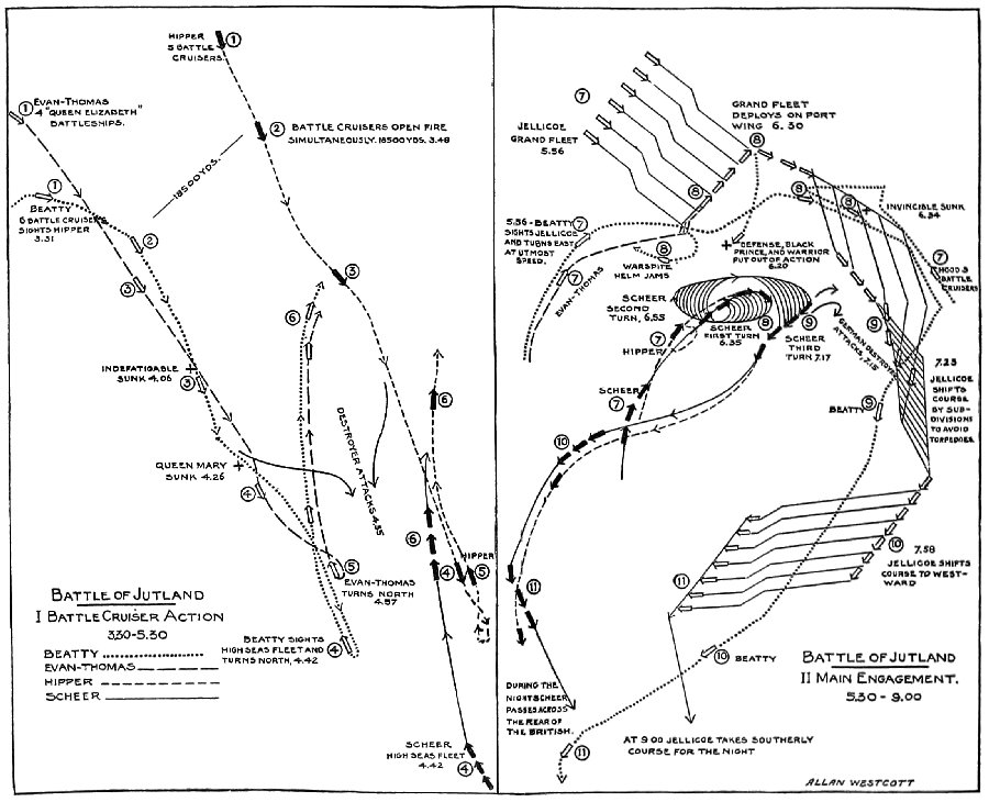 “The Ships of the Grand Fleet, in pursuance of the general policy of periodical sweeps through the North Sea, had left its base on the previous day in3 accordance with instructions issued by me. In the early afternoon of Wednesday, May 31, the 1st and 2nd Battle Cruiser Squadrons, the 1st, 2nd, and 3rd Light Cruiser Squadrons, and destroyers from the 1st, 9th, and 13th Flotillas, supported by the Fifth Battle Squadron, were, in accordance with my directions, scouting to the southward of the Battle Fleet.” (J)