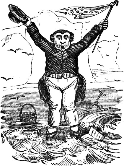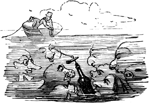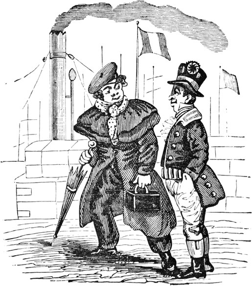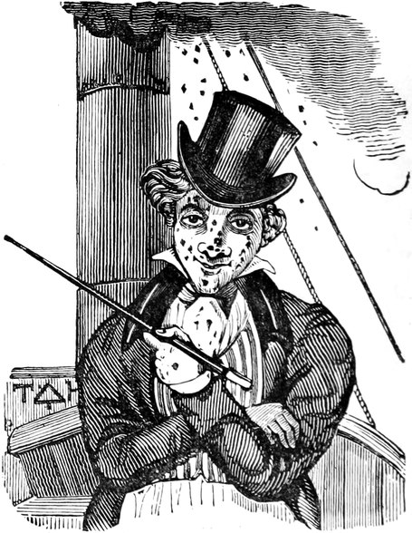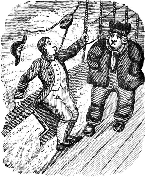 “Thankee—of course not,” said the Original with a sneer.[Pg 438] “I’ve no right to put my hand in my pocket! Not that I mind expense. But it’s my right I stand up for, and I defy you both to prove that I have any right—or any shadow of a right—to be in your company! I’ll tell you what, Skipper”—but before he could finish the sentence, he turned suddenly pale, made a most grotesque wry face, and rushed forward to the bow of the vessel. The Captain exchanged a significant smile with the stout gentleman; but before they had quite spoken their minds of the absent character, he came scrambling back to the binnacle, upon which he rested with both hands, while he thrust his working visage within a foot of the skipper’s face.