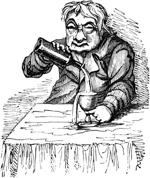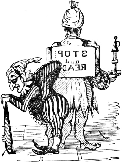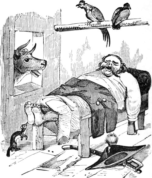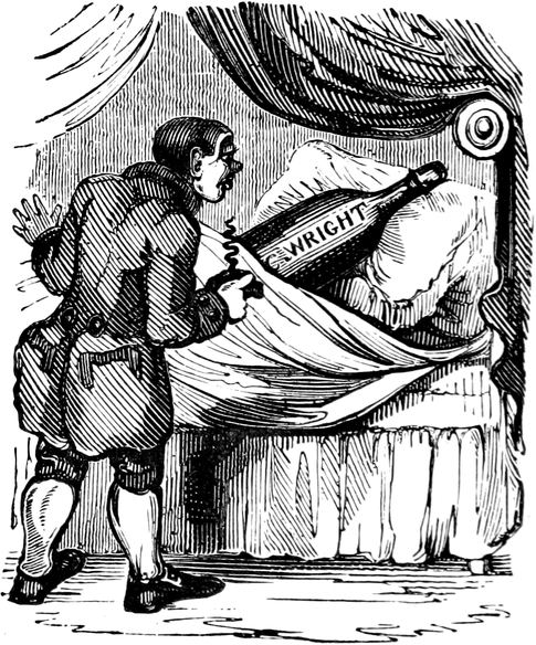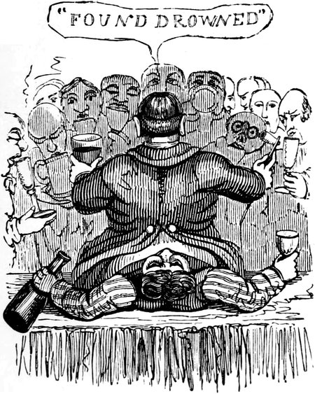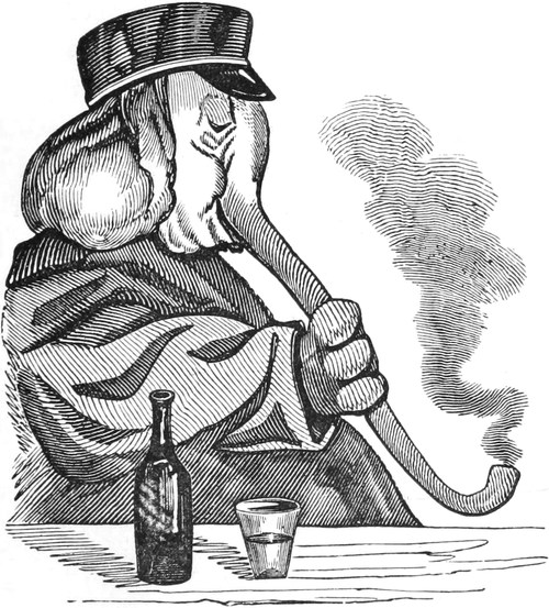OF all the signs of the times—considering them literally as signs, and the public literally as “a public”—there are none more remarkable than the Hahnemann’s Head,—the Crown and Compasses, devoted to Gall and Spurzheim’s entire,—and the Cock and Bull, that hangs out at the House of Call for Animal Magnetizers. The last concern, especially—a daring, glaring, flaring, gin-palace-like establishment—is a moral phenomenon.[Pg 453] That a tap dispensing a raw, heady, very unrectified article, should obtain any custom whatever, in a reputed genteel and well-lighted neighbourhood, seems quite impossible; yet such is the incomprehensible fact;—respectable parties, scientific men, and even physicians, in good practice in all other respects, have notoriously frequented the bar, from which they have issued again, walking all sorts of ways at once, or more frequently falling asleep on the steps, but still talking such “rambling skimble-skamble stuff” as would naturally be suggested by the incoherent visions of a drunken man. Such exhibitions, however are comparatively rare in London to their occurrence in Paris, which city has always taken the lead of our own capital in matters of novelty. It is asserted by a good authority, that at a French concern, in the same line, no[Pg 454] less than seventy-eight “medical men, and sixty-three other very intelligent individuals,” became thoroughly muzzy and mystified, and so completely lost all “clairvoyance” of their own, that they applied to an individual to read a book and a letter to them; to tell them the hour on their own watches; to mention the pips on the cards; and by way of putting the state of their “intuitive foresight” beyond question, they actually appealed to the backsight of a man who was sound asleep! A bout on so large a scale has not been attempted, hitherto, in the English metropolis; but as all fashions transplanted from Paris flourish vigorously in our soil, it is not improbable that we may yet see a Meeting of the College of Physi[Pg 455]cians rendered very how-come-you-so indeed by an excess of Mesmer’s “particular.” The influence of such an example could not fail to have a powerful influence on all classes; and a pernicious narcotic would come into general use; the notorious effect of which is to undermine the reason of its votaries, and rob them of their common senses. To avert such a national evil, surely demands the timely efforts of our philanthropists; and above all, of those persons who have set their faces against the Old Tom—not of Lincoln, but of London—and in their zeal for the public sobriety, aim at even converting the brewers’ kilderkins into pumpkins.—Seriously, might not the Temperance Societies extend the sphere of their operations by a whole hemisphere, and perhaps with equal advantage to mankind, by attacking mental dram-drinking, as well as the bodily tippling of ardent spirits? The bewildered rollings, reelings, and idiotic effusions of mere animal drunkenness can hardly be more degrading to rational human beings, than the crazy toddlings and twaddlings of a bemused mind, whether only maudlin with infinitesimal doses of quackery, or rampant to mad staggers with the lushious compounds and Devil’s Elixirs of the Mesmerian Distillery. Take the wildest freaks of the most fuddled, muddled, bepuddled soaker,—such as “trying to light his pipe at a pump,”—attempting to wind up a plug with his watch-key,—or requesting, from a damp bed in the gutter, to be tucked in,—and are they a bit, or a whit, or a jot, or a what-not, more absurd, more extravagant, or more indicative of imbecility of reason, than the vagary of a somnambulist, gravely going through the back-gammon of reading Back’s Journal, or a back-number of the Retrospective Review, through the back of his head?