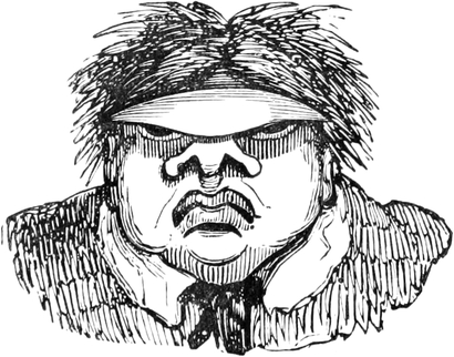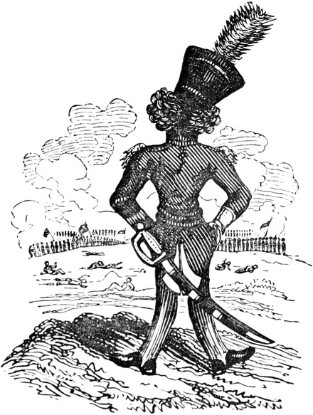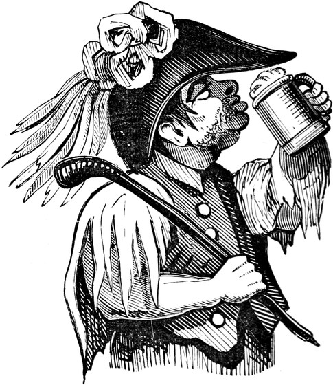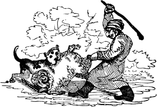 We had scarcely trotted half a mile in meditative silence, when we overtook a sturdy pedestrian, who was pacing the breadth as well as the length of the road, rather more like a land surveyor than a mere traveller. He evidently belonged to the agricultural class, which Ned had distinguished by the title of Small Farmers. Like Scott’s Liddesdale yeoman, he wore a shaggy dreadnought, below which you saw two well-fatted calves, penned in a pair of huge top-boots—the tops and the boots being of such different shades of brown as you may observe in two arable fields of various soil, a rich loam and a clay. In his hand he carried a formidable knotted club-stick, and a member of the Heralds’ College would have set him down at once a tenant of the Earl of Leicester, he looked so like a bear with a ragged staff.