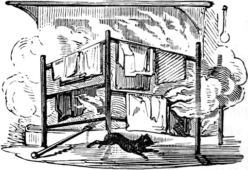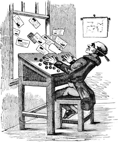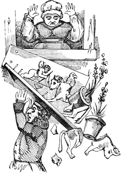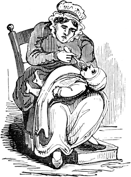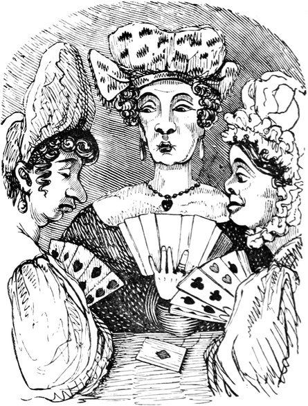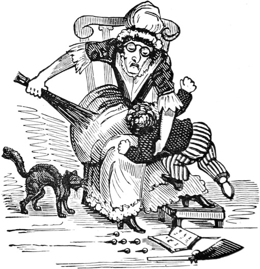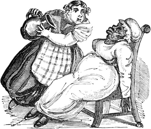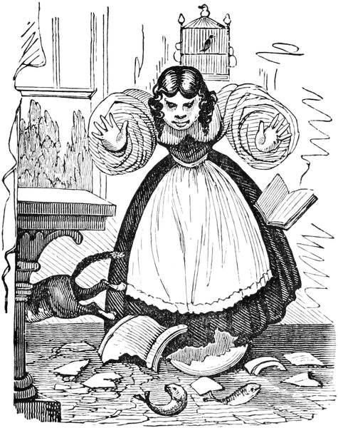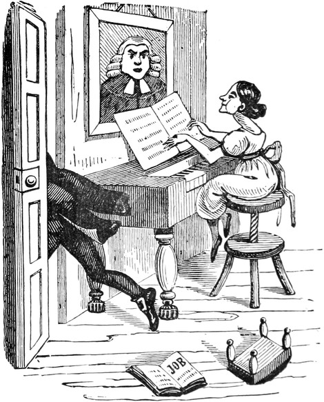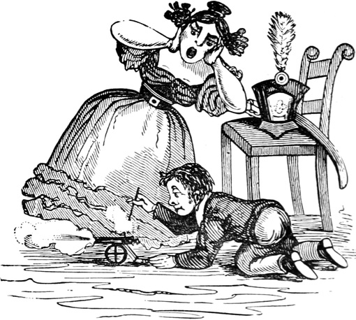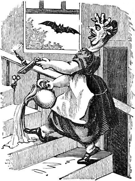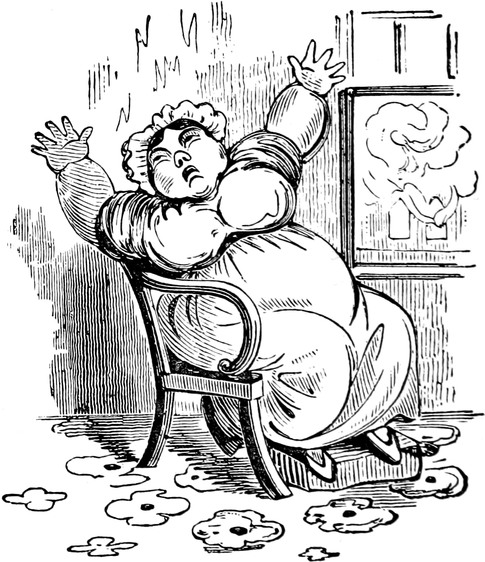 Since the above accident we have had, thank goodness, no more blows; but, as Your Lordship is aware, a first impression will stick by us for all our lives to come. At the best of times, let my husband be reading, or writing, or eating his dinner, or[Pg 446] in bed, or what not, the exploding notion will come across him like a flash of lightning; as for instance last Friday was a week. Mr. and Mrs. Trotter had dropped in to tea; after which we had a rubber; and were all very comfortable, my husband and me just in the nine holes, when all of a sudden there was a fall of something and a scream. Up jumps Mr. D. of course, chucking his cards here, there, and every where, and calling a blow! a blow!—and as usual Emily and Lucy and Eliza and me rushed off to the coal-cellar, while Mrs. T. went into a fit. It is true, by the blessing of Providence, it was only the Housemaid letting her pail fall to screech at a bat; but what is very disagreeable, the Trotters are old friends, and have declined to set another foot within our doors. As for servants, it is next to impossible to keep one about me; and as Your Lordship’s own[Pg 447] Lady will confirm, there is nothing more unpleasant to a Mistress of a House than to be continually changing. But nine out of ten prefer giving warning, to attending to so many punctiliums as are laid down; and those that are willing to stay, break through so many of the rules, that I am obliged to discharge them, to prevent Mr. D. being ruffled by doing it himself. Besides it adds considerably to servants’ work, to have chimneys swept so often as once a week,—and moreover, Mr. D. insists on keeping all flints and steels, and tinder, and matches, in his own bed-room, so that the housemaid has to go to him every morning for her lights. He is just as particular about extinguishing at night; and I lost the best cook I ever had, through her sitting up in her bed-room to mend her stays, though she might have known Mr. D. would come in to put her out—all of which is extremely unpleasant, and to me in particular.