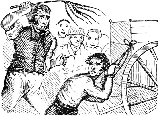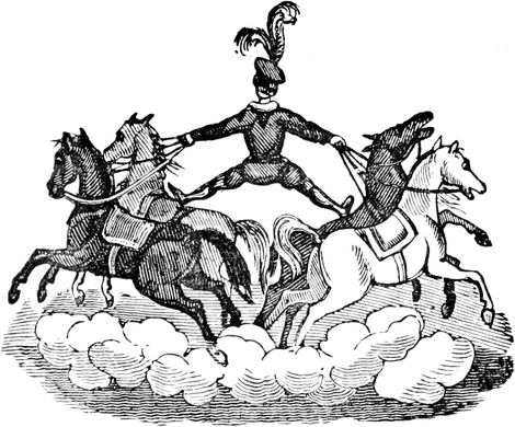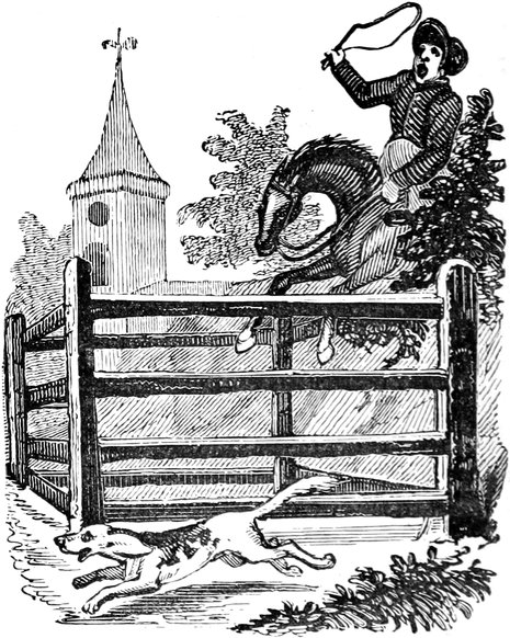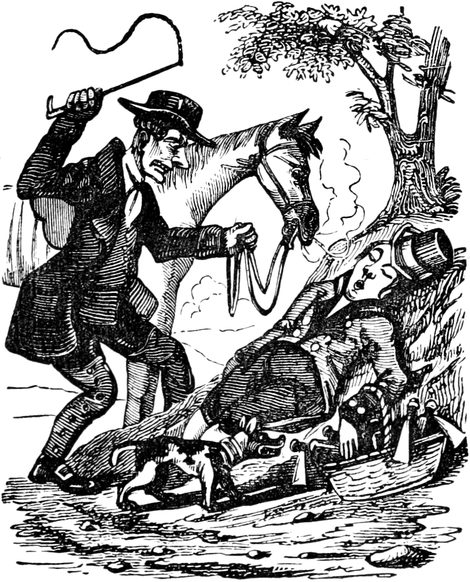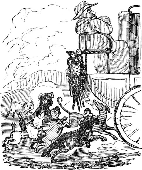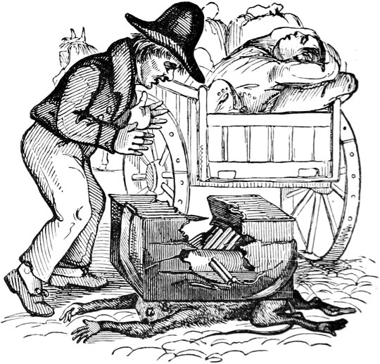 I observed that Ned seemed anxious. One of his leaders was a bolter, and his wheelers were far from steady; and the man ahead walked not quite so straightly as if he had been ploughing a furrow. We were almost upon him—Ned gave a sharp halloo—the man looked back, and wavered. A minute decided the matter. He escaped Scylla, but Charybdis yawned for him—in plain prose, he cleared the Rocket, but contrived to get under the broad wheel of a Warwickshire waggon, which was passing[Pg 9] in the opposite direction. There was still a chance,—even a fly-waggon may be stopped without much notice—but the waggoner was inside, sweethearting with three maids that were going to Coventry. Every voice cried out Woh! but the right one. The horses plodded on—the wheels rumbled—the bells jingled—we all thought a knell.