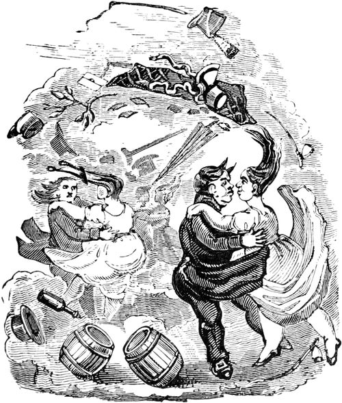 For my own part, Your Lordship, I looked on the Duke’s letter of congratulations as neither more nor less than my poor husband’s death-warrant. Indeed he was so dreadfully alarmed himself, as to be quite distressing to witness. He did nothing, the whole afternoon, but walk up and down the room, shaking his head at himself in the looking-glass, or looking up at the ceiling, and muttering, as if he was already exploding sky high along with the Mills. But a refusal was out of the question, as it would have afforded his Grace too good an excuse for neglecting our interests for the future. To aggravate the case, the very day after our taking possession, there was what is called a blow at the works, and though so trifling as only to carry a roof off a shed, it struck a cord on Mr. D.’s nerves that has never done[Pg 444] vibrating ever since. I do not exaggerate to say, that if he had been struck with the palsy and St. Vitus, both at once, he could not have showed more corporeal agitation. He trembled in every limb like an aspen tree; while his eyes rolled, and his head went from side to side, like the China Mandarin’s; besides scouring up and down stairs, and rushing out of doors and in again, and trying all the chairs but could not sit any where, and stamping, and muttering, and dancing about, till I really expected he would scramble up the walls of the room, and fly across the ceiling, like our tortoiseshell cat in her fits. If I lived to Methusalem, Your Lordship, I should never forget it! Unluckily, being new to his office, a mistaken notion of duty possessed him that he ought not to quit the spot; indeed he solemnly declared, that if a blow was to take place in his absence, he would rather commit his own suicide than face the report of it in the newspapers, which had already indulged in some seditious sneers at his appointment. All that could be done, therefore, was to pack off Lucy, and Emily and Eliza, on week’s visits among friends; myself remaining behind, as a wife’s proper post, near my poor husband; but on the discomfortable condition of keeping under ground in the cellar, because gunpowder in convulsions always blasts upwards. What my feelings were, as we are troubled with rats, Your Lordship may suppose; particularly when Mr. D. was officially called upon to inspect the damage; and never shall I forget his gashly appearance when he returned from his awful task! He was literally as white as a sheet; and totally incapable to get out a word, till he had swallowed three whole glasses of brandy! That settled his reason,—but it was only to tell me that lie had scraped and grazed the skin off every nubble of his back-bone, by a bad fall from a ladder, which he had attempted to come down in wooden safety shoes. Such, Your Lordship, was our miserable day; and it brought as wretched a night. Bed would not be heard[Pg 445] of—and we set up in two easy chairs, shuddering with fright and cold, being December, and every door and window thrown wide open, to give a thorough vent through the house, in case of another shock. For Mr. D. was unfortunately possessed that one blow always leads to another; and what with fancying flying sparks, for it was starlight, and sniffing fire, he had worked himself up, before morning, into a high fever and a light head. The nearest medical man was obliged to be called in—and he had to give frightful doses of laudanum before Mr. D.’s nerves could be lulled into a startlish sort of doze;—and at waking, he was ordered to drink the strongest stimuluses; as indeed are in use to the present time. But this continual brandy, brandy, brandy, as Your Lordship knows, is a dreadful remedy; though, as my poor husband says, he cannot fill up his place without its help. At times I could almost believe, tho’ I would not breathe such a thing except to Your Lordship, that between the stimuluses, and the delirium, and the whole shock to the system, Mr. D. is a little beside his senses. The mad Doctors do say, that we are all, every one of us, crazy on a certain subject; and if such is the case, there can be no doubt that my husband’s weak point is explosions, the extravagance of his precautions making him an everlasting torment to himself as well as to all about him. Of course it is to his disadvantage, and magnifies his terrors, not to have been brought regularly up to the business; not that he receives much comfort from those who have, for he says custom and habit have made them so daring and hardened, that they would not mind playing at snap-dragon in the Magazine, or grinding their knives on the millstone that crushes the gunpowder into grains.
