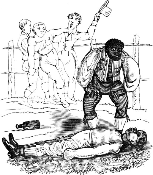 “My reason is,” replied Ned, “that they’re all as hard as nails—regular pebbles for game. They take more thrashing than their own corn, and that’s saying something. They’re all fortitude, and nothing else. Talk about punishment! nothing comes amiss to ’em, from butt-ends of whips and brickbats down to bludgeons loaded with lead. You can’t hurt their feelings. They’re jist like badgers, the more you welt ’em the more they grin, and when it’s over, maybe a turn-up at a cattle fair, or a stop by footpads, they’ll go home to their missises all over blood and wounds as cool and comfortable as cowcumbers, with holes in their heads enough to scarify a whole hospital of army surgeons.”