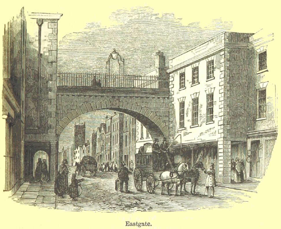 The Railway Station.—Chester the Terminus of Six Railways.—Flookersbrook.—Lead Works.—Canal and Bridge.—William Penn, the Quaker.—Foregate Street, and the old Watling Street.—Post-Office, and Old Bank.—The East Gate, Roman and Mediæval.—The East Gate of To-day |
