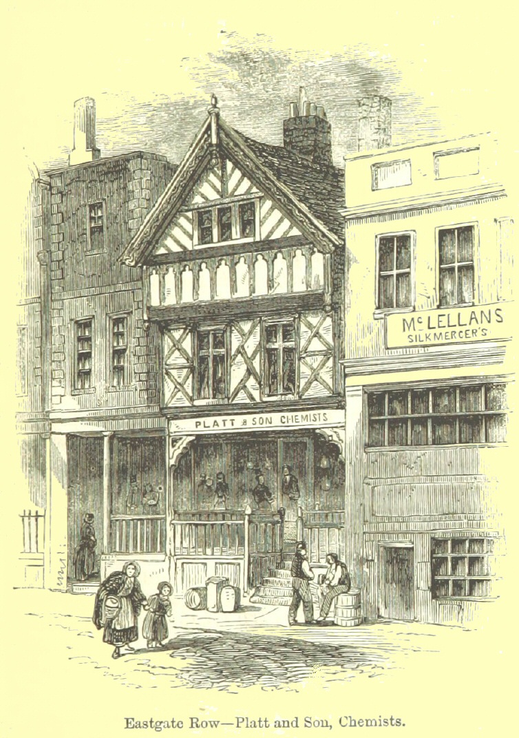 “The summer of the year 1507, was memorable here from the awful visitation of the ‘sweating sickness,’ which raged for a short time with great violence. It is recorded that 91 householders were carried off in three days by this distemper; but it is worthy of remark, that the female sex were generally exempt from the plague, only four having fallen victims to the disease. Cats and women have each nine lives! In 1517, the sweating sickness again proved fatal to many of the inhabitants; and the city was also infected with the plague, probably to a more serious extent. It is recorded that ‘many died and others fled out of the city, insomuch that the streets were full of grass;’ and ‘that for want of trading the grass did grow a foot high at the Cross, and in other streets of the city.’ In 1550 the city suffered severely from the sweating sickness, and to this affliction was added a great scarcity of provisions; corn selling in Chester at sixteen shillings a bushel. From the year 1602 to 1605, with few intermissions, the dreadful effects of the plague were experienced in the city. It is stated to p. 7have begun in the month of September, in the former year, at the house of one Glover, in St. John’s lane, in whose house alone seven persons died. The contagion was particularly fatal in 1603 and 1604; 650 persons died in the former year, and 986 in the latter; at one period 55 died weekly.—During this dreadful visitation, the fairs of the city were suspended, the court of exchequer was removed to Tarvin, and the county assizes were held at Nantwich. The plague had abated in the month of February 1605.”