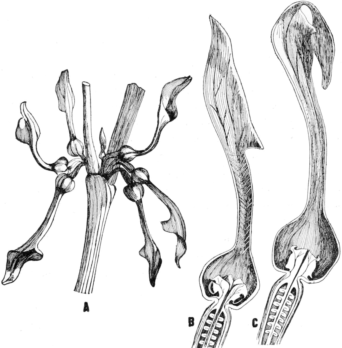 The leaf of the Venus’s fly-trap, which suddenly closes together from the sides when a fly or other light body comes to rest on it, is certainly a remarkable adaptation. A copious secretion of a digestive fluid is poured out on the surface of the leaf, and the products of digestion are absorbed. 10There can be no question that this contrivance is of some use to the plant. In other insectivorous plants, the pitcher plants, the leaves are transformed into pitchers. In Nepenthes a digestive fluid is secreted from the walls. A line of glands secreting a sweet fluid serves to attract insects to the top of the pitcher, whence they may wander or fall into the fluid inside, and there being drowned, they are digested. A lidlike cover projecting over the opening of the pitcher is supposed to be of use to keep out the rain.