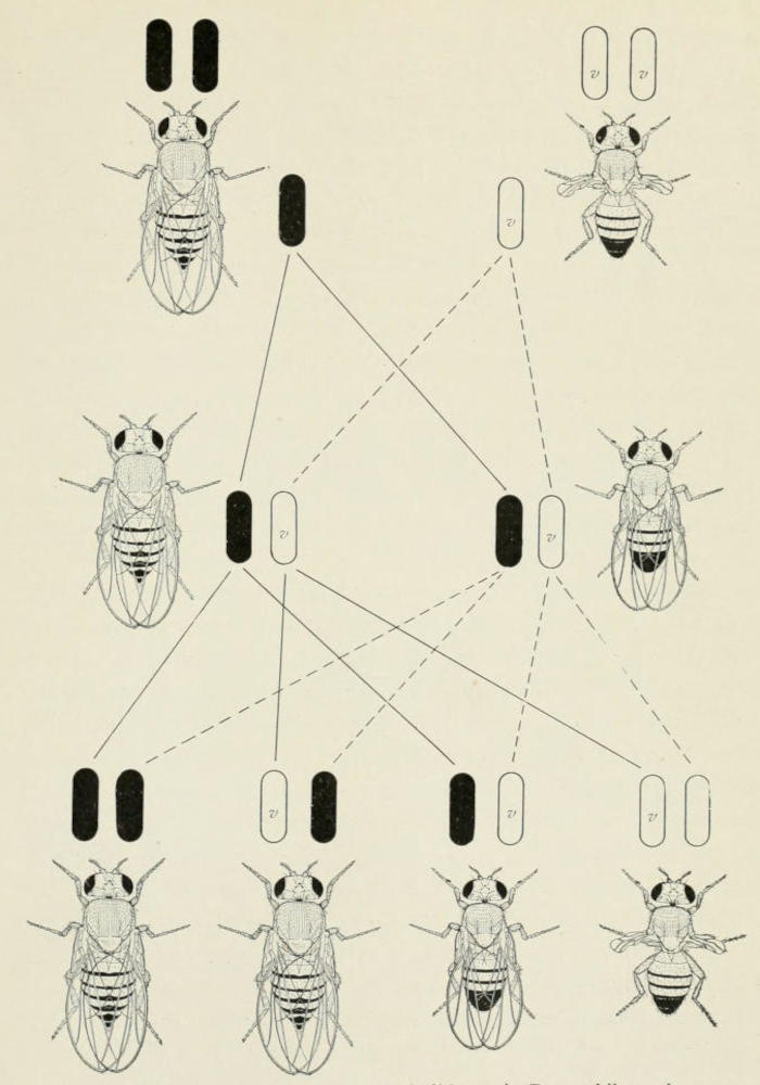 Fig. 1. Cross between long-winged (wild type) Drosophila melanogaster and vestigial-winged fly, producing long-winged offspring (F₁), which if bred to each other give in the next generation 3 long to 1 vestigial. In the middle of the diagram, the pair of chromosomes that are involved in this cross are represented. The chromosome with the factor (gene) for long wings is here black; that for vestigial is open (v).
