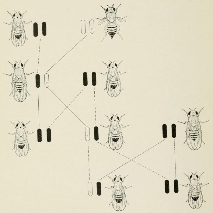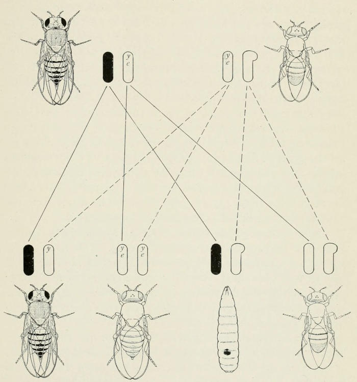 Fig. 14. Diagram showing inheritance of a sex-linked recessive lethal (“tumor”) factor in Drosophila melanogaster. Here, in the center of the diagram, the sex-chromosome that carries the lethal factor is represented by the black rod. A female with the tumor-factor, normal wings and red eyes, in one of her sex-chromosomes and with the factors for yellow wings and eosin eyes in the other is bred in each generation to a male with yellow wings and eosin eyes. In the next generation there are twice as many daughters as sons, since all the sons that carry the black chromosome die. The half of the daughters (i.e., those not yellow eosin) that carry the black chromosome repeat the same history. The linkage of yellow and eosin enables one to pick out in each generation those daughters that carry the tumor-factor.