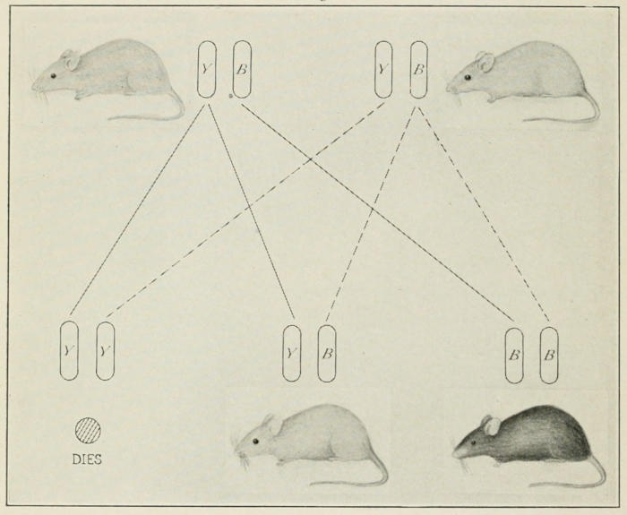 Fig. 4. Yellow mouse (YB) crossed to yellow mouse (YB) produces here black and yellow offspring, in the ratio of 2:1. These yellow are again hybrid, and if bred to each other give the same result again. Pure yellow (YY) offspring die at early stage. They constitute one quarter of all the offspring.