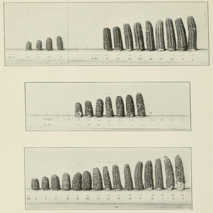 Before we take up the main questions before us this evening, I must speak of one other form of heredity. In many instances we have evidence that a character is the product of more than a single mutant gene. I say “mutant gene” because in fact every character is no doubt the product of the combined action of many genes, but in addition to this general relation there are many cases now known where there are several specific genes whose chief effect is on one character. Size differences furnish abundant data of this sort. One of the clearest cases is that of the size of the ear of corn. Some races of corn have short ears (and cobs), some long. If two such races are crossed, the hybrid is intermediate with a considerable range of variation. If the hybrid is self-fertilized, the progeny in the next generation shows a still wider range of variation, extending from that of the shorter grandparent to that of the longer. Both grandparental cobs have reappeared, but also many intermediate grades, Fig. 5.