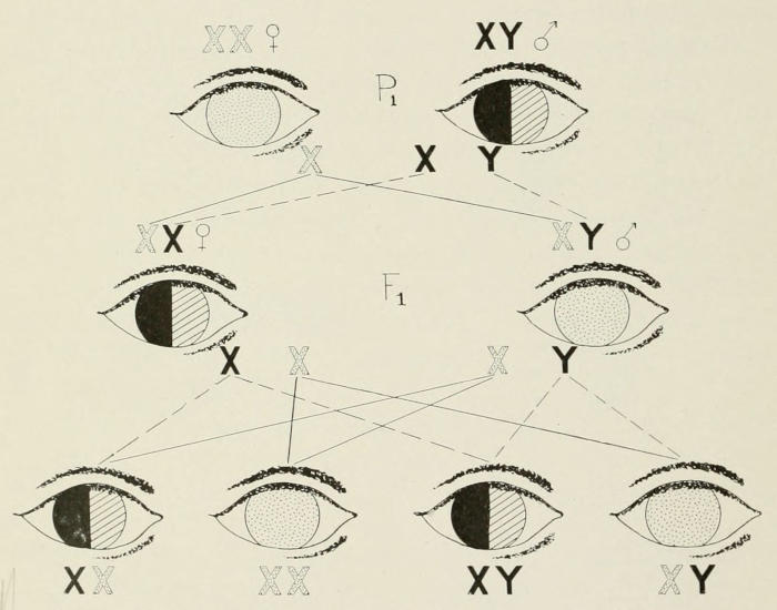 Fig. 6. Inheritance of color blindness of man which is sex-linked (i.e., the factor for color blindness is carried in the X-chromosome). This X-chromosome is stippled in the figure while the X-chromosomes for normal eyes are represented by black X’s. The color-blind eye is also stippled, and the normal eye (which distinguishes between red and green) is here represented by an eye half black and half cross-lined. The 1st generation offspring (F₁) are normal eyed. In the 2d generation offspring, half the sons are color blind.