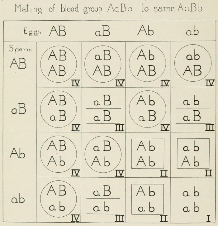 These sixteen individuals fall into four groups according to whether they have both A and B, or only A, or only B, or neither A nor B (i.e., ab) in the proportion of 9AB:3A:3B:1ab. These four genetic classes correspond to the four recognized blood types IV, II, III, I, as indicated in the diagram. Now these sixteen kinds of individuals are found in all populations, so far studied, although in somewhat different proportions in different “races.”