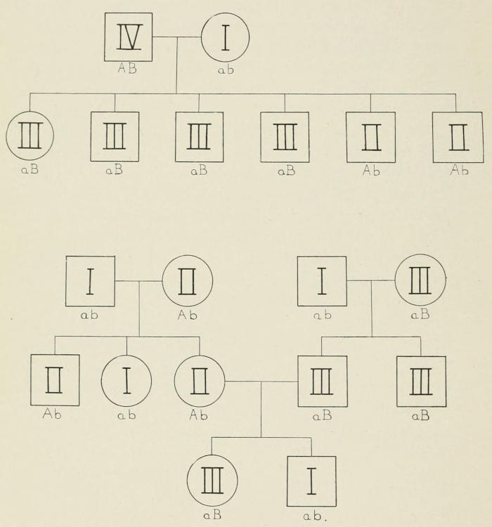Fig. 9. The upper pedigree gives the children from the family in which types I and IV were the parents. The offspring belong to types II and III (two of the four possible kinds of offspring).