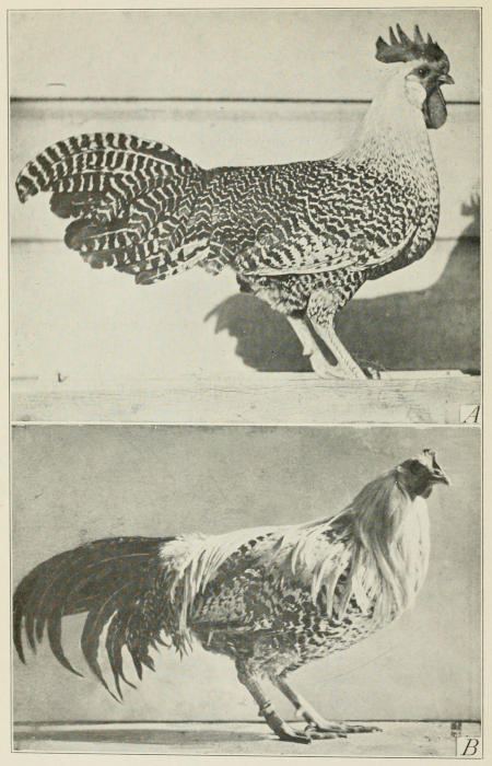 Fig. 10. Above (A) normal adult hen-feathered Campine cock. Below (B) castrated cock about one year after operation. The castrated bird has developed the secondary sexual characters of cock-feathering.