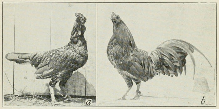 Fig. 11. To left (a) hen-feathered Sebright cock. To right (b) castrated Sebright cock that has developed characteristic cock-feathering.