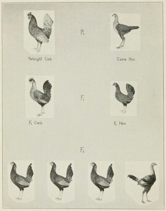 If the Sebright male is out-crossed to a hen of another breed in which only cock-feathered males occur, it will be found that all the first generation males are hen-feathered. If these are now bred to their sisters there are produced, in the second generation, three hen-feathered males to one cock-feathered male, showing that the difference between the two races is inherited, Fig. 12.